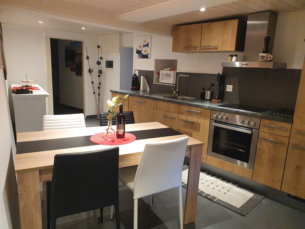 Located in the center of Saastal / Mattertal / Visp and the surrounding area, the apartment offers a maximum of 5 people enough space. The two bedrooms can accommodate a total of 4 people. Another person can also sleep on the comfortable sofa bed. The cozy dining area with stylish real wood furniture invites you to linger. The large TV and free Wi-Fi provide entertainment on rainy days and the first-class kitchen offers everything you need.