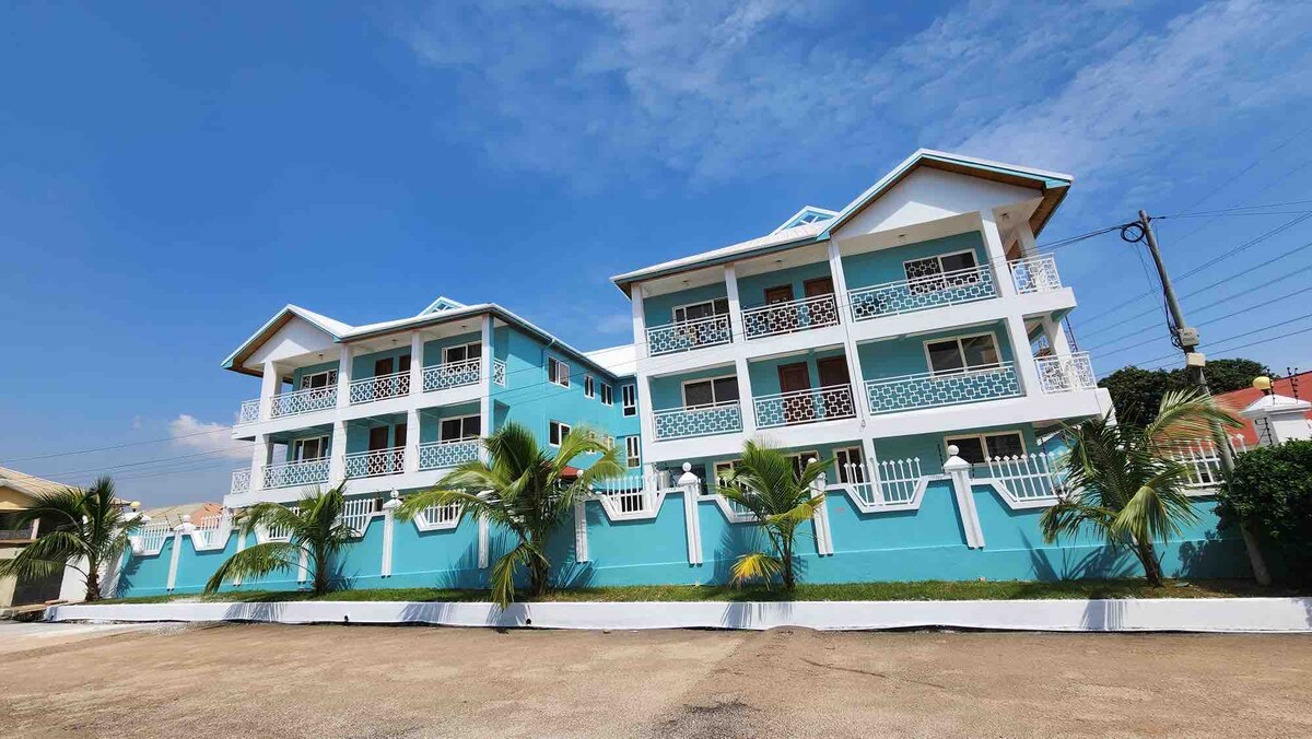 Stress free 2-bedroom suite in Kumasi, 2 bathrooms, visitor’s toilet for privacy, open floor plan, and PRIME location just 10 minutes from Kumasi Airport. Enjoy the convenience of private parking, FREE FAST WiFi, a 55” Smart TV,. Power outage? No worry, backup power plant, and 24/7 strict SECURITY for your peace and comfort is our priority. Self-check-in with confirmation code only. Explore nearby restaurants and shops, or relax at lounge or Rooftop garden. 10years hosting..come experience..
