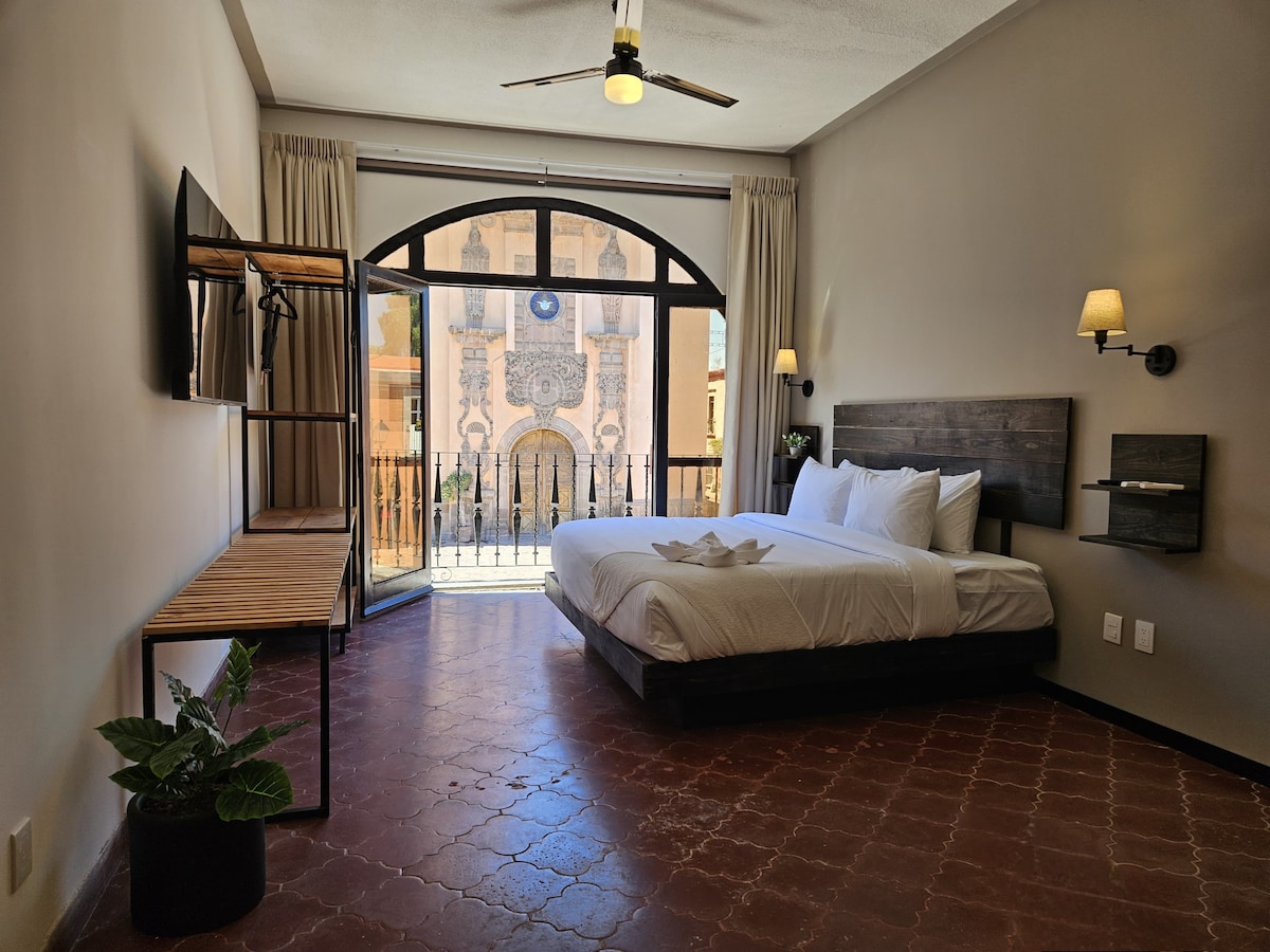 We invite you to experience comfort and privacy in our rustic-modern Studio! Integrated within an old mansion in the historic center of Querétaro, just a few blocks away from the cathedral and the historic Teatro de la República, our location is privileged in the heart of the city, in a peaceful area away from nighttime noise. Come and enjoy an unforgettable stay!