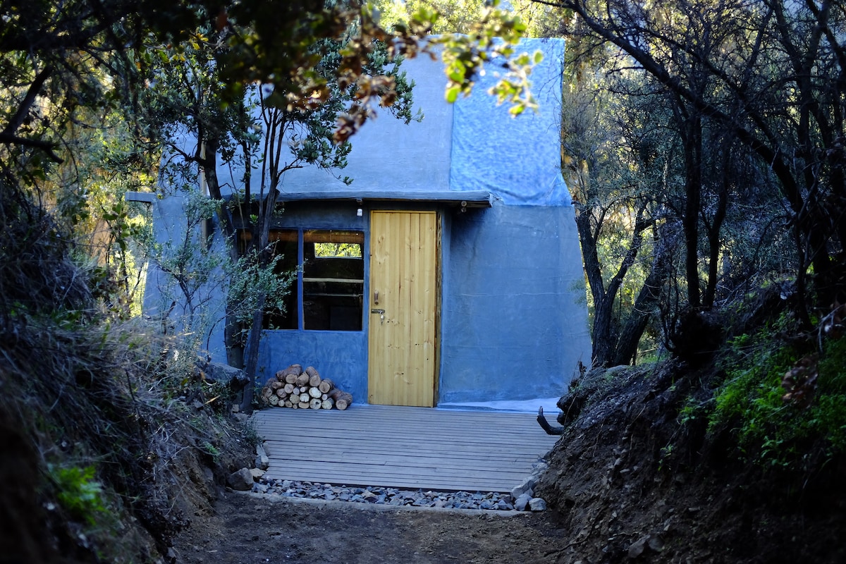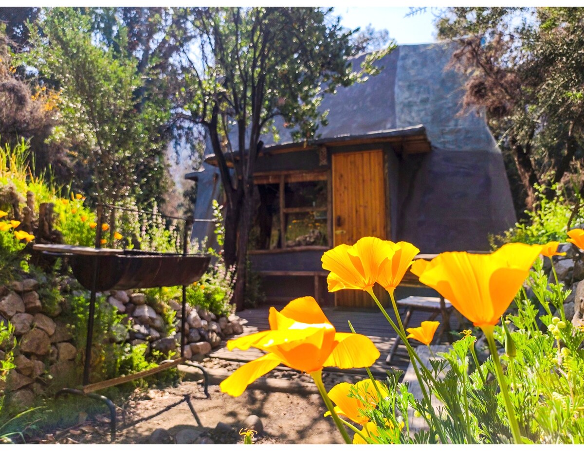 See El Arca Naranja, Ecologic Cabin too! Cabaña for 2 people, 20 min from Santiago, surrunded by montains, trees and wild life. Kitchen all equipped, gaz stove for cooking, little oven, fridge, inside bathroom, hot shower and fireplace. Trekking routes, street and mountain bike, little river to swim, gardens with aromatic plants and spices, hammock, barbecue grill, near ski centers and mountains landscape, local handcraft. Available week and week end Discount for longer stay