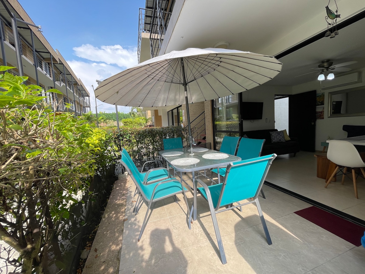 Sensational and elegant apartment-hotel surrounded by nature; fully equipped for a pleasant stay. You can enjoy a new, impeccable place with a fresh and cozy design; 24-hour surveillance. 5 minutes from the airport and 20 minutes from Parque del Café. Resort-style amenities: 3 pools, slide, children's games, jacuzzi, BBQ, washing machine. Strategically located to get to know the entire coffee region and cities such as Pereira (1h30m) and Cali (2h30m).