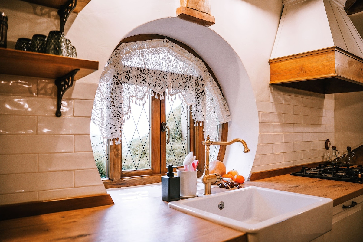 A small medieval village in a magical setting at the foot of Gredos. Conformed by 3 casitas with vegetable roof, garden and an incredible Nordic bathtub in each house. La Casita del Druida is a cozy fairytale cabin. It houses 2 bedrooms with amazing double beds, living room with indoor fireplace, TV and a comfortable sofa-bed, fully equipped open kitchen, and a spacious bathroom with shower. Original and independent project, unrelated to trademarks or registered works.