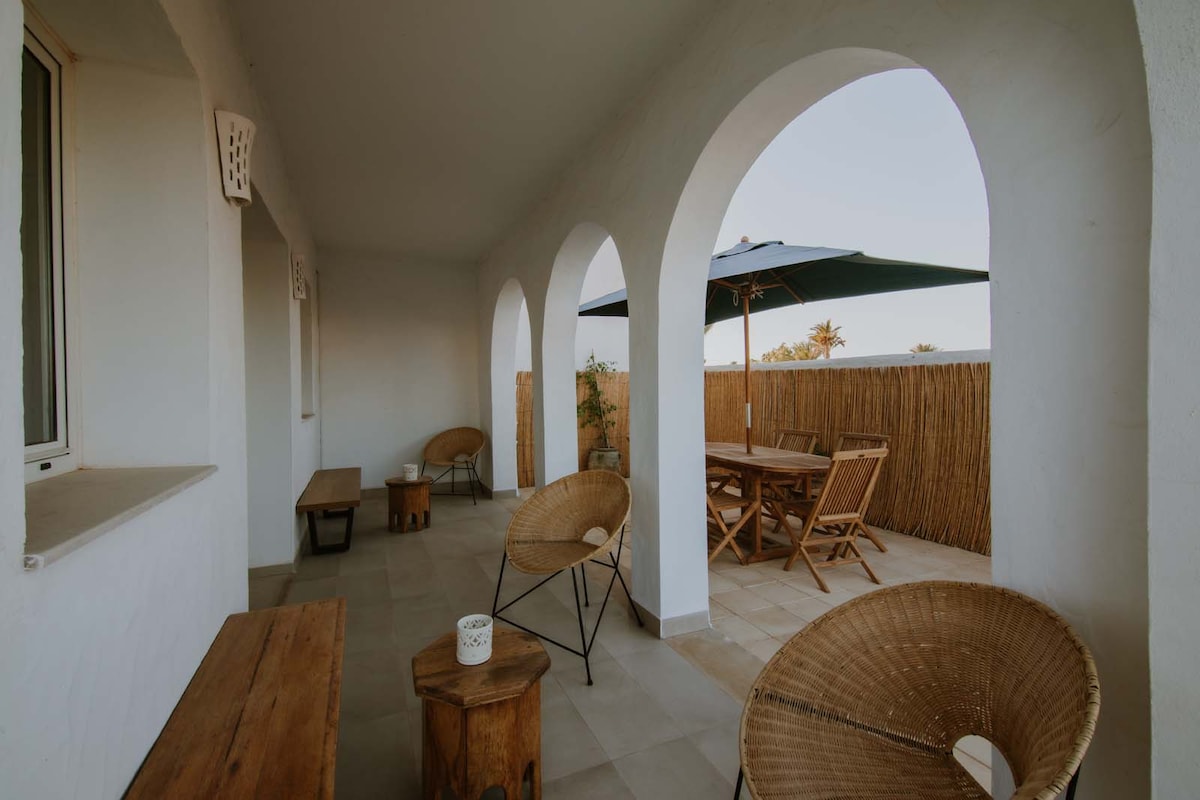 Our small house in a typical Djerbian style is located 60 meters from the beach. Ideal for a couple with a child, it has a double bedroom, a living room with two benches, an equipped kitchen, bathroom with shower and toilet. This small cocoon of tranquility has a shaded terrace and its private garden. Close to shops, hotel amenities (beaches, swimming pools, bars, restaurants, SPA, and massages) and behind the Djerba Casino
