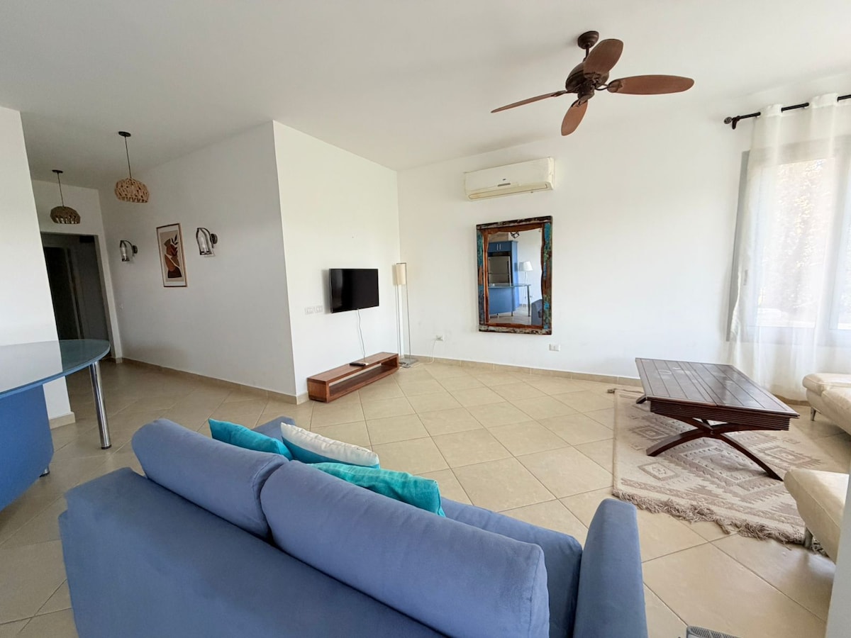 Relax with the whole family at this peaceful place to stay. It is 3 bedrooms first floor chalet. The chalet is fully air conditioned with amenities including a fully equiped open kitchen, smart TV, living area, balkony and a roof with dining area and BBQ, on spacious golf garden. The flat is walkable to adult pool and shaded kids pool. 4 minutes by car to Jazz hotel and large sandy beach.