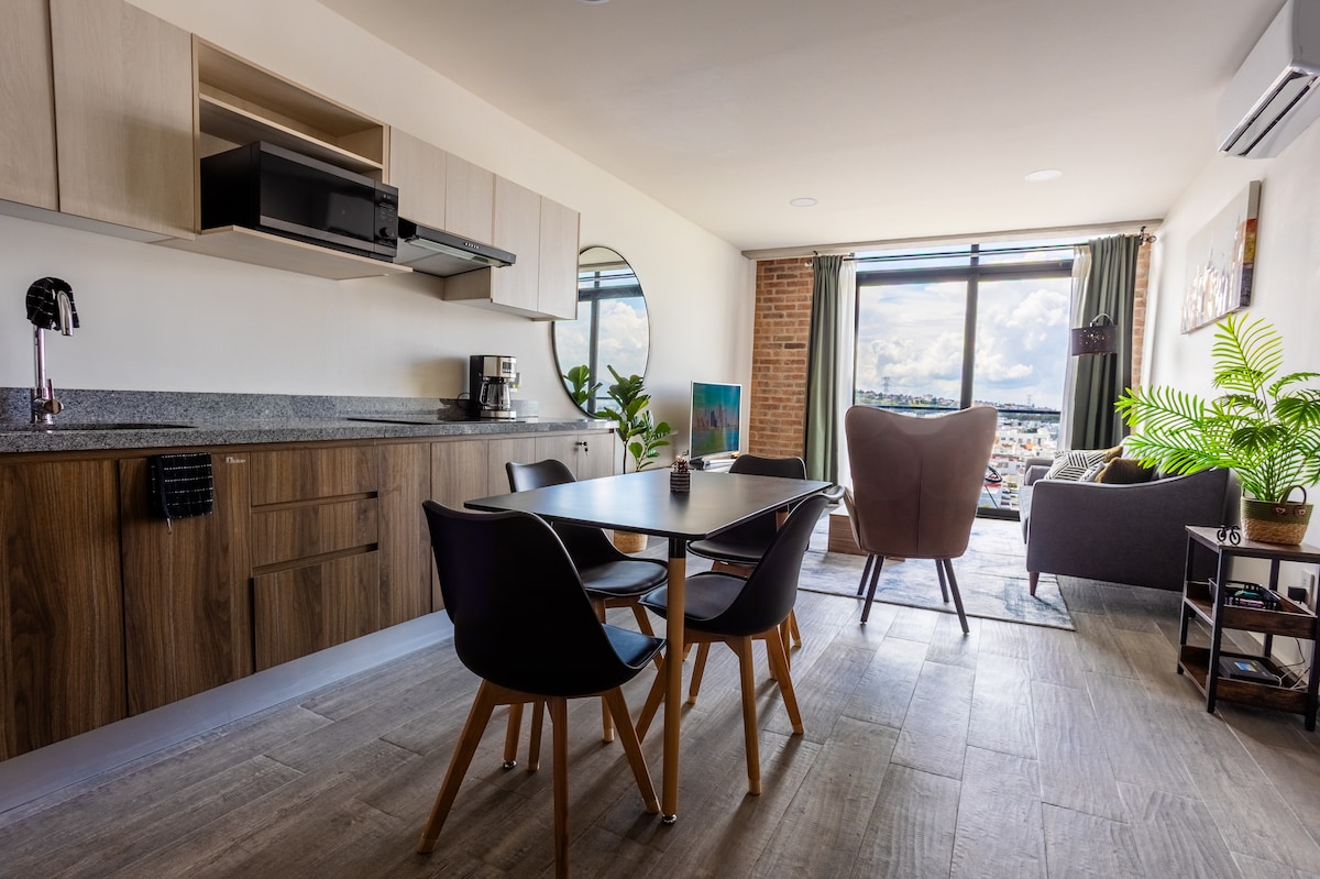 -22nd floor swimming pool -Beautiful gym with city views -Fully equipped for long stays -Parking available (at additional cost) - Housekeeping service: Once a week for reservation of +7 nights This deluxe studio with a balcony has everything you'll need for your stay. Located in a brand-new luxury tower in the Providencia neighborhood, near the Midtown Jalisco shopping mall.