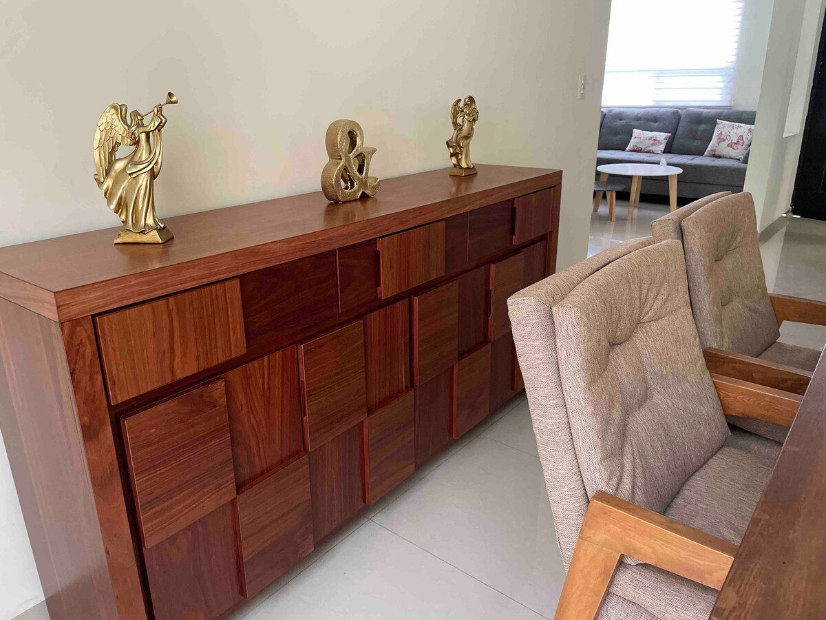 We invoice. Escape to a warm, modern and newly renovated boutique-style house. 19 minutes from the airport and 35 minutes from downtown Monterrey, in a private area with 24/7 surveillance, close to industrial parks and shops. Enjoy boutique bathrooms, A/C and heating bedrooms, 75” mini LED screens with Bang & Olufsen sound in the living room and bedroom. Streaming apps, Xbox, board games and patio with TV, barbecue and outdoor furniture. Furniture with Saint Laurent stone. Everything for you to have a great experience