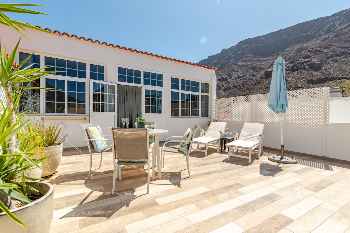 Disconnect from the routine in this unique and relaxing penthouse where you can enjoy its two large terraces with mountain views. The town of Mogán was established in 1833 to initially protect itself against pirate ship attacks. It is located 9kms from the port city and beach of Mogán. Space declared by UNESCO as "World Biosphere Reserve of Gran Canaria" in 2005. For sports lovers where they can go hiking, cycling, excursions, diving...