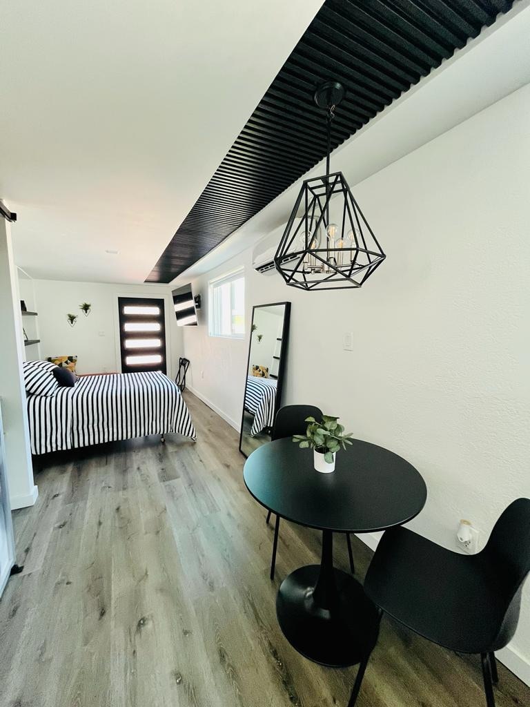 Just Listed! Modern Open Concept Studio Loft with Modern Kitchen, Large Bathroom, Cold A/C, 50" 4K TV and Fiber-fast Internet! Kitchen has granite quartz counter top, a bar-like table with three chairs, a small fridge to keep your beverages cold, a microwave, coffee maker, pots and pans to cook a quick meal. Comfy Queen-size Bed with a Wardrobe, A small desk and chair to work remotely. Enjoy a 20% discount on stays of 28 days or more!