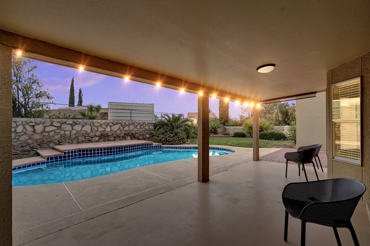 Experience the vibrant Mexican-American culture and its warm hospitality in this updated, open-concept home. Whether you're in town to work, relax, or play, this spacious 3 BR/2 BA home with game room, 500+Mbps, refrigerated AC, king suite & gourmet kitchen has it all. Relax by the fire table or hammock pergola in the NEW backyard retreat w/basketball court & pickleball! Close to I-10, airport, UTEP/UMC/downtown/FtBliss/HuecoTanks/eats/parks/shops. We look forward to welcoming you. ¡Bienvenidos!