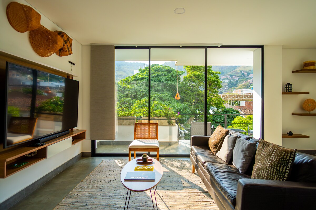 Edificio con diseño moderno para disfrutar de las mejores vistas de Cali, tiene una ubicación estratégica en el norte de la ciudad: ¡será muy fácil planear tu visita! Cerca al aeropuerto, centros comerciales y zona gastronómica. Apartamento con amplio balcón privado con hamaca y sofá, cama queen, escritorio, cocina totalmente dotada, lavadora y baño. Terraza con vista 360 sobre la ciudad de Cali te permitirá gozar de la brisa y los atardeceres caleños. Cuenta con ducha al aire libre y BBQ.