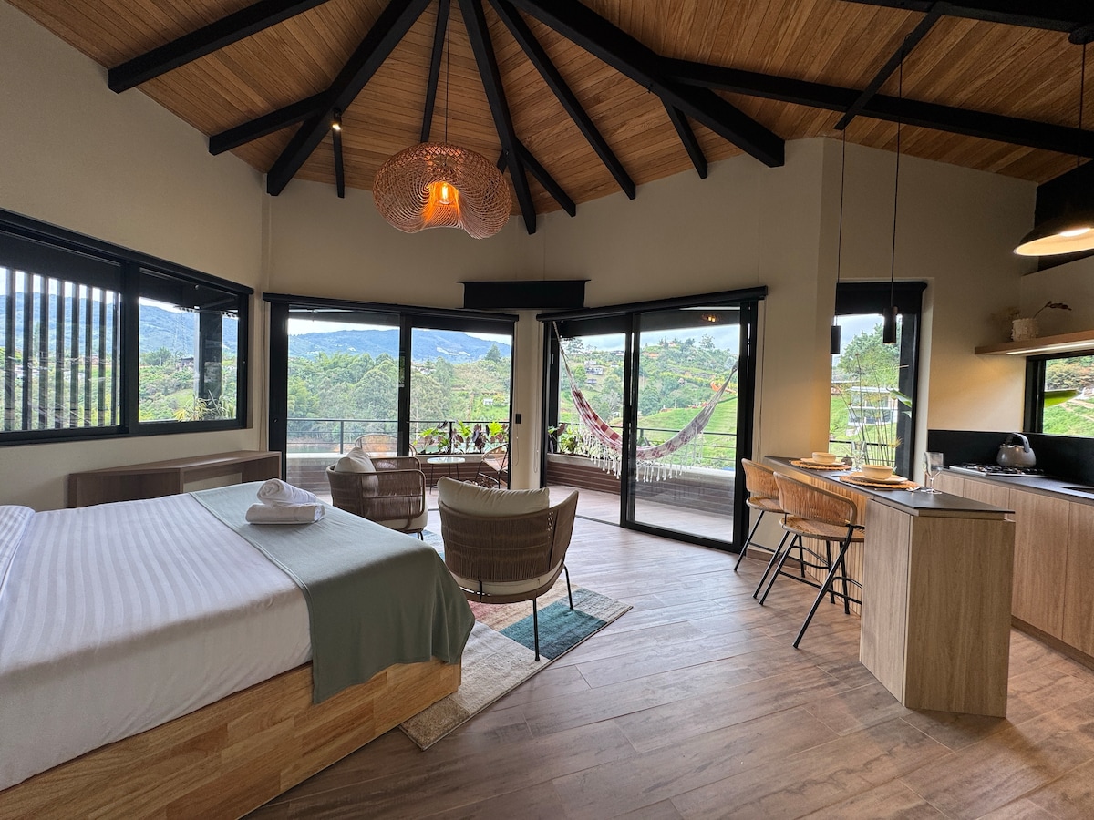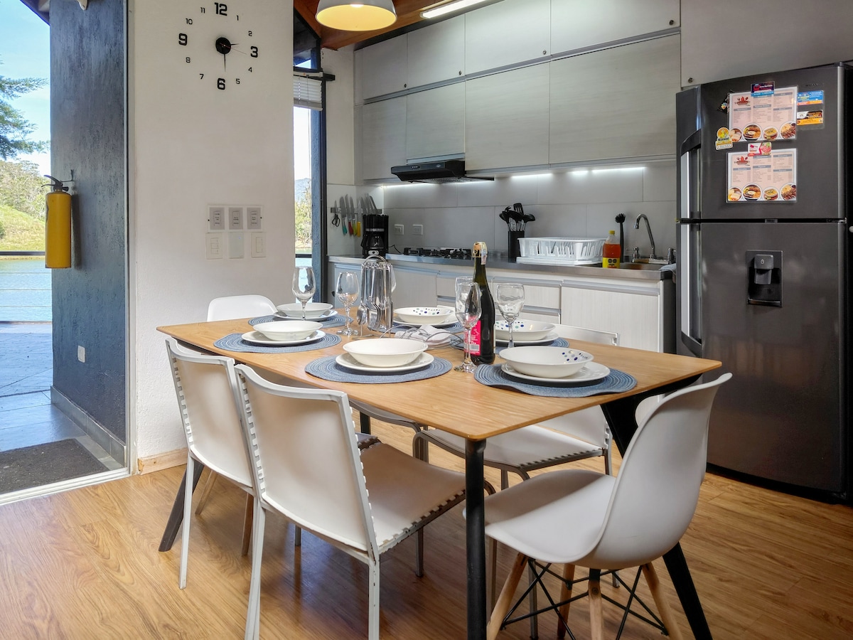 🥘 Room service with local cuisine made from fresh ingredients grown in our garden and prepared on the spot 🍳 Breakfast included 🌐 High-speed fiber WiFi to stay connected 🛁 Private jacuzzi with stunning lake view 🔥 Gas fireplace for cozy nights 🚣♀️ Kayak and paddle board included to explore the lake 🐦 Birdwatching right from your terrace 📍 Located across the lake from one of the region’s most iconic estates, only 15 minutes from La Piedra del Peñol and 18 minutes from Guatapé.