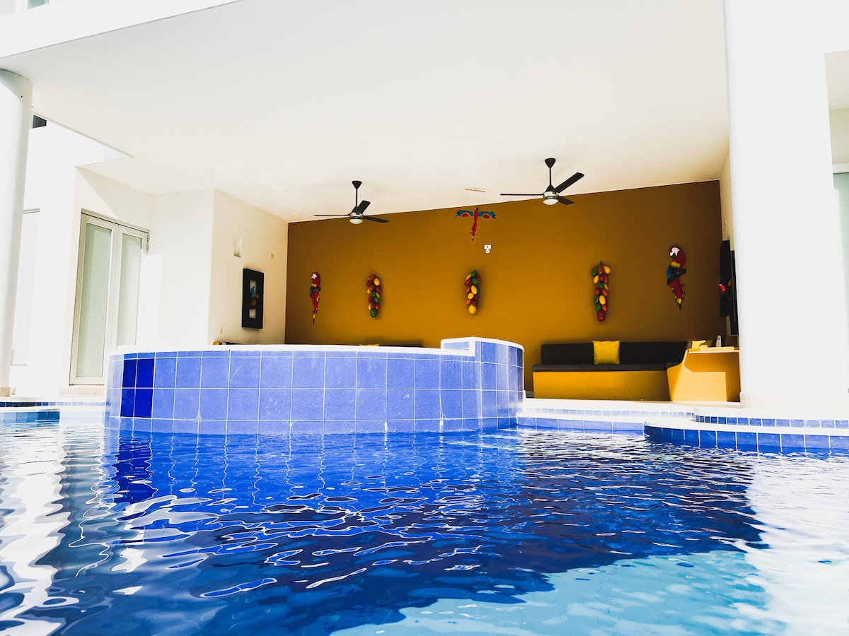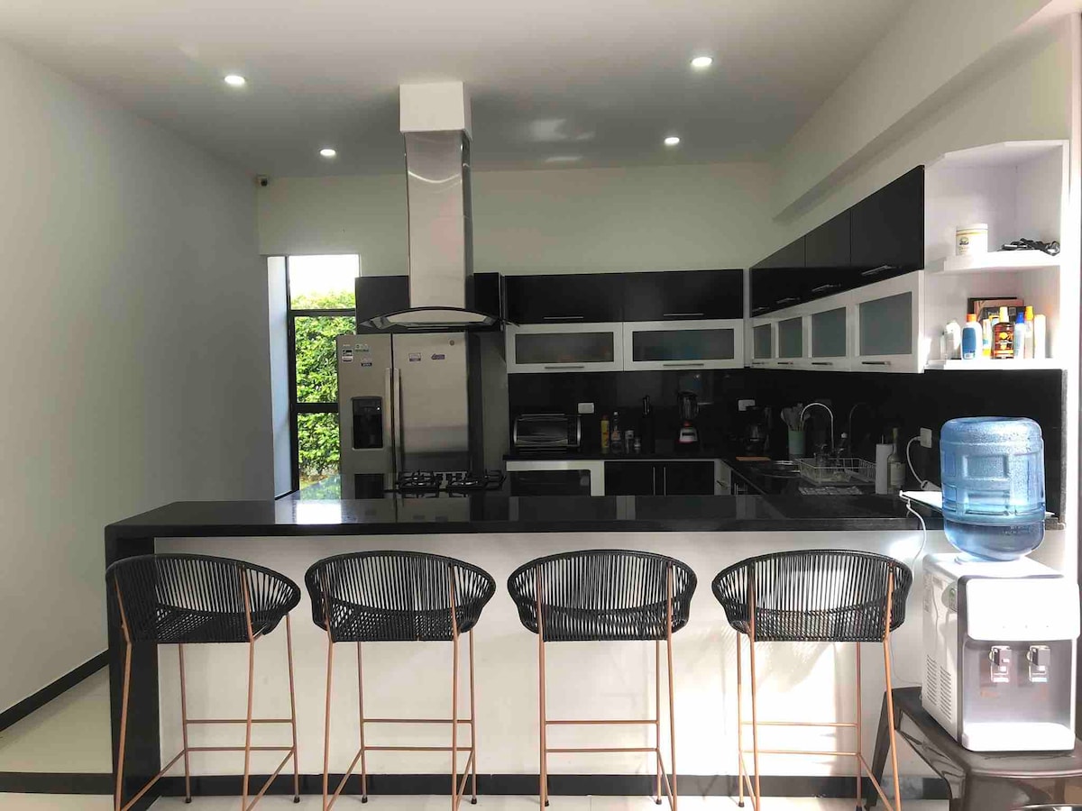Modern and spacious country house just 5 minutes away from Girardot. Enjoy the wonderful, sunny weather in a private house that includes: AC and private bathrooms in every room; private pool, jacuzzi and Turkish bath; kitchen with all appliances; BBQ area that operates on wood, gas and carbon; inner and outer dining tables; washing machine; social areas ideal for large groups, with Smart TV and AC; gym.