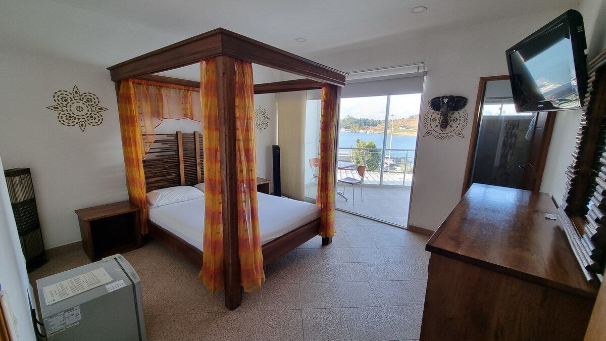 Enjoy this exclusive hotel located in front of the Guatapé dam, featuring a heated pool, à la carte restaurant, water sports, free Wi-Fi, and direct access to the dam. We have the best views of Guatapé from anywhere in the hotel, high-quality food in the restaurant, massage services, and also very easy access from the main road. The room has a private bathroom, TV, kitchenette, and microwave.