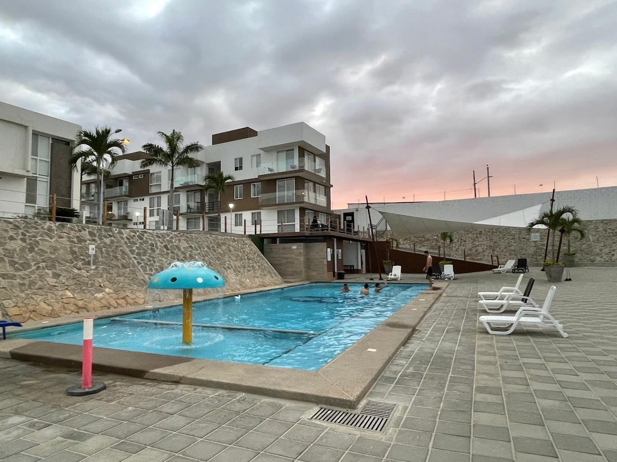 Have fun with your whole family in this luxury-style accommodation. An excellent location 20 meters from the beach, a spectacular view on the top floor of the building, and you can enjoy the entire cruise with the city of Manta in the background.