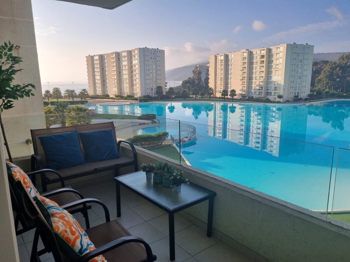 Escápate de la rutina a menos de dos horas de Santiago. Increíble departamento con dormitorio principal cama King con baño en suite y dormitorio 2 con camarote y cama individual, con baño en pasillo, con sábanas y toallas, cuenta con gran vista, wifi, tv en dormitorio y living, parrilla a gas, Calefaccion, amoblado full para disfrutar junto a los tuyos!! Estacionamiento. A pocos minutos de la playa, cafés y restaurantes, cuenta con piscina, quedamos atentos a tus duda!!