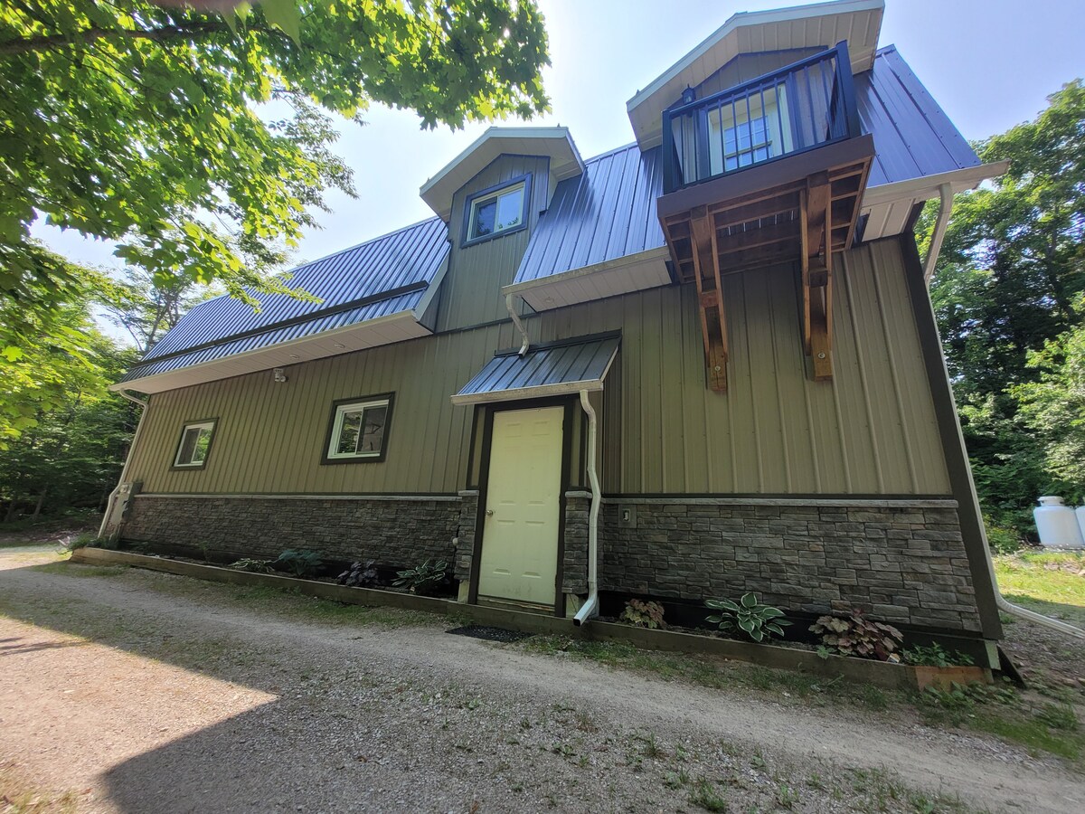 Peaceful forested land with a bluff across it - Year-round! New spacious and quality furnished guesthouse for your comfort and enjoyment. 2 bedroom, open concept with propane fireplace, stand-alone Jacuzzi room (standard size tub), and separate toilet room. Infrared 2-person sauna! A well equipped kitchen, Starlink internet, 60" 4K 'smart' TV, Bell HD pvr, sound system, and a leather couch. A large equipped deck, small balcony, and fire pit area with sitting logs. Private..