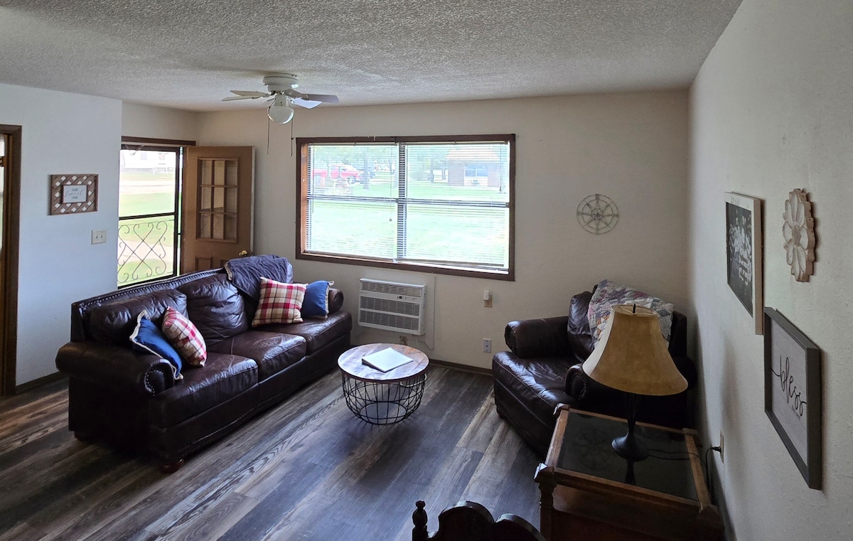Escapt to this 2-bed, 1-bath home tucked in the Flint Hills. Enjoy sweeping farmland views, plush leather couches, Roku TV, full kitchen with gas stove, washer/dryer, and Starlink internet. Sip coffee on the patio, watch the sunset, and let the fenced yard offer peace of mind for pets or kids. Fresh air, quiet moments, and farm-inspired comfort await—ask about farm-store add-ons to make your stay extra special.