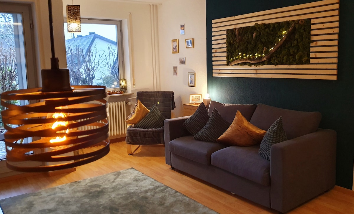 5-star awarded holiday flat "Kuckucksnest" ideal for large groups. → 4 bedrooms with king-size beds → Comfortable sofa beds for additional guests → Large living room with huge couch → Free sauna & gym → Wood-burning fireplace → Large garden with fire pit & barbecue → Kitchen → Rain shower & bathtub → Hiking highlights & supermarket within walking distance ☆ "The flat was amazing! Beautifully and lovingly renovated, with lots of charm, wood and a cosy garden... An absolute highlight!"
