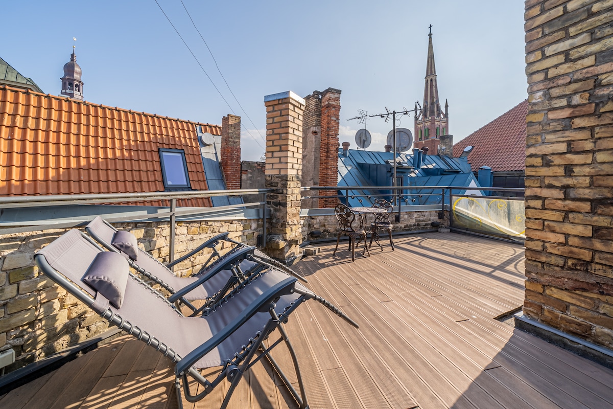 Contemporary and spacious two-story apartment on the top floor with high ceilings, plenty of daylight, and a large terrace. The apartment is located in the Art Nouveau District, a prestigious and affluent neighborhood just a 10-minute walk from the Old Town, known for its architecture and selection of restaurants and bars. You'll love the apartment's space, relaxing atmosphere, large terrace, fully equipped kitchen, dining area, and living room. Perfect for unwinding after exploring the city.