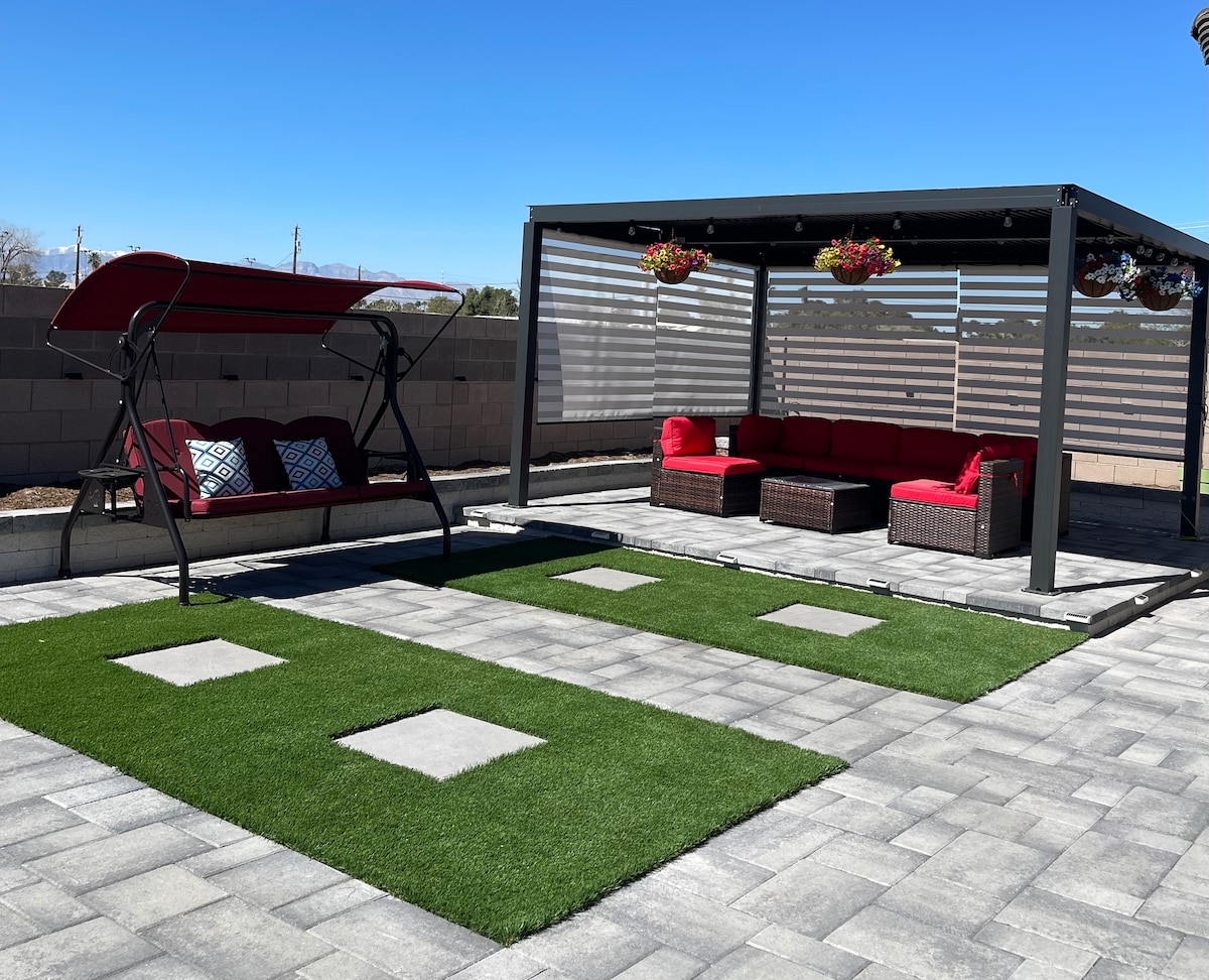 Escape to our 1-acre desert oasis in Las Vegas! Our home offers a unique blend of coziness and excitement, with a balcony boasting stunning mountain views and a glimpse of the vibrant Las Vegas Strip. 1200 sqft of living space for up to 4 person, 22’ pool 4’ depth with slide, Pickleball and basketball Enjoy a short par 3 golf course right in your backyard, . Experience the magic of the desert landscape, just a short drive from the bustling Strip. Your adventure awaits here in this desert haven
