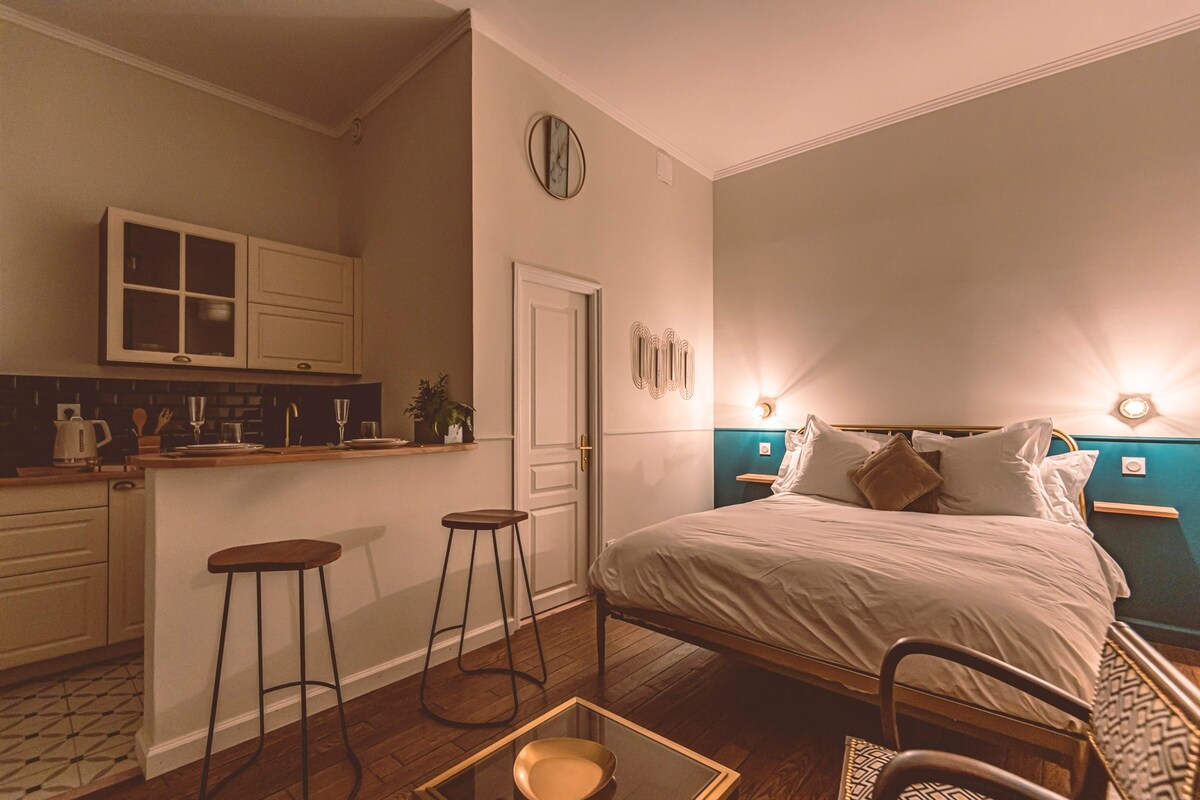 Set down your bags in this large, chic, high-end studio apartment with all the comforts, completely renovated by an architect, in the heart of Reims. Everything is within walking distance: the central train station, Place d'Erlon, Boulingrin, restaurants, and shops are just a few meters away. A rare location and an elegant, comfortable setting for a carefree stay. ⚠️ Bicycles are not allowed in the apartment.