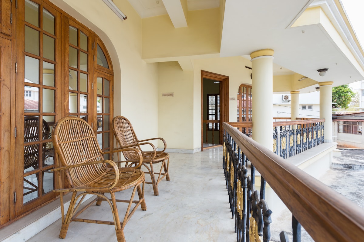 A spacious, newly renovated homestay near Fort Kochi. Come discover this accommodation just 2.5km from the heart of Fort Kochi. 'The Green Room' offers the following features: -Double bed for a restful night's sleep (can be separated to twins on request) -Private attached bathroom -Fast Wi-fi -Smart TV -Air conditioning and fans -Antique wooden furnishings -Dedicated workspace -Common area with microwave, fridge and kettle -Open outdoor spaces for reading, relaxing