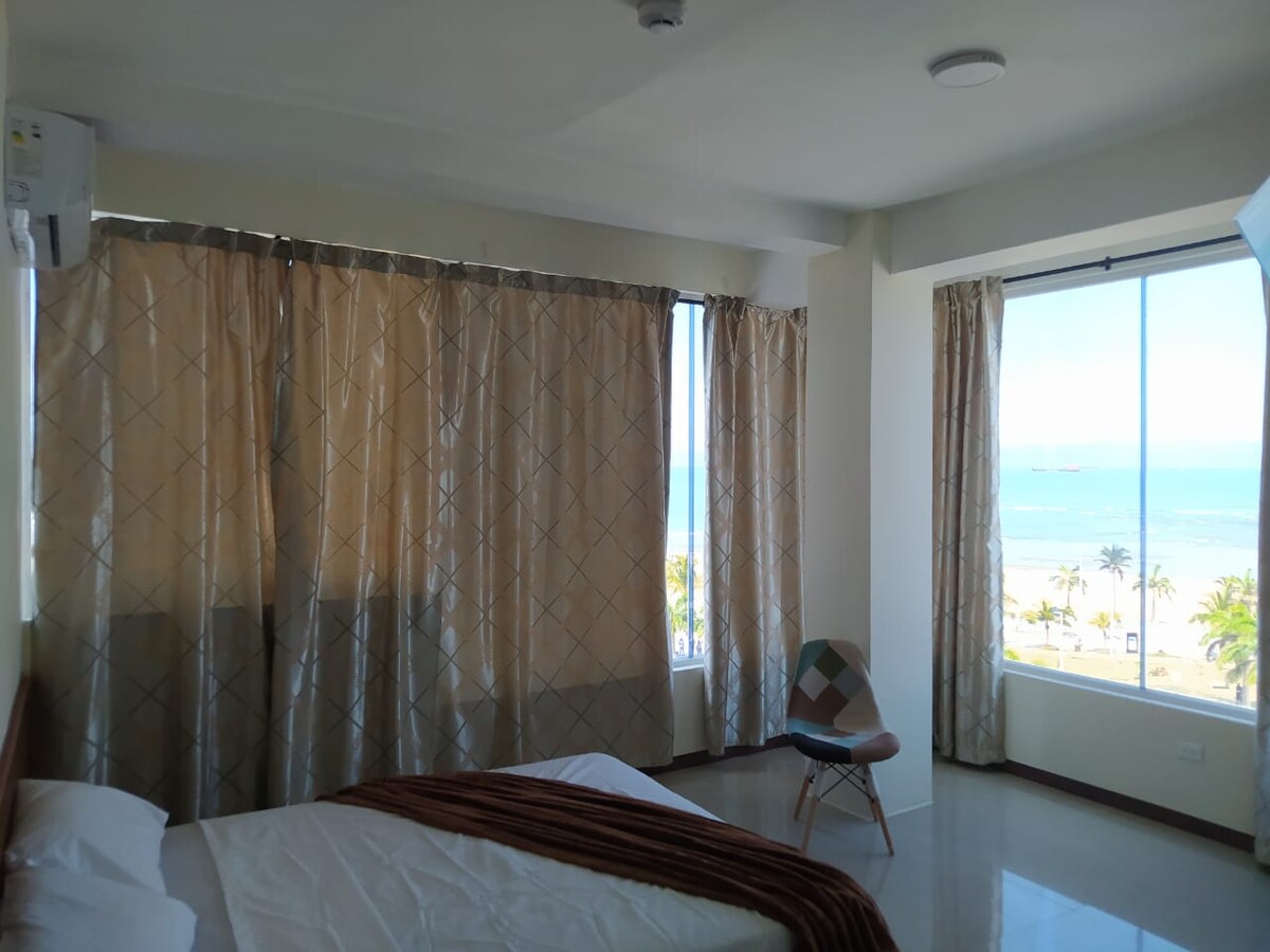 Relax and enjoy the most beautiful area of Esmeraldas, the safest and most exclusive place in the city. With a capacity for 2 people, our rooms are ideal for enjoying a relaxing vacation near the sea. The rooms have an unparalleled view, you can relax or work quietly while walking on the beach and sleep listening to the waves of the sea. The rooms are located in a modern and cozy building.