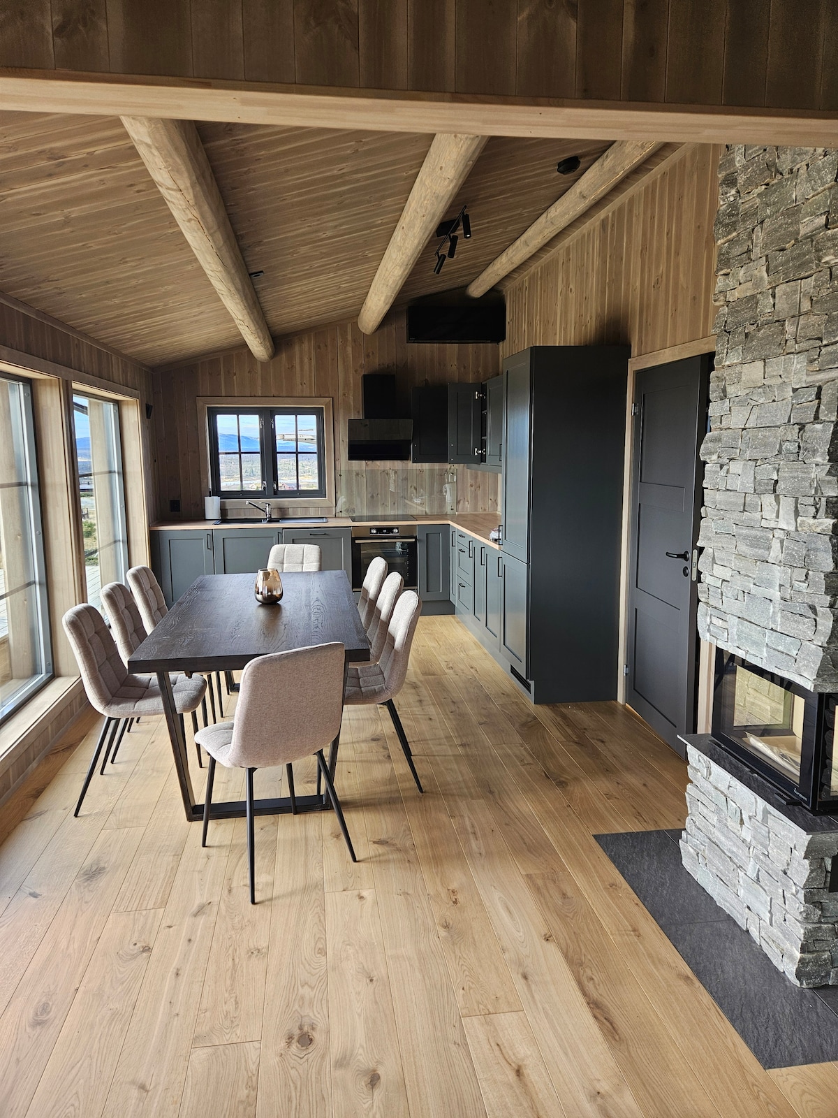 Large newly built cabin with great location at the top of the alpine area, 100 m to the ski lift. Cross-country ski trails in the immediate vicinity. In summer, you have morning sun on the breakfast terrace, before the afternoon sun stretches around to a large combined terrace in slate and wood, with fantastic views of Jotunheimen! Great hiking terrain all year round. Two bedrooms and two bathrooms on the 1st floor. Loft with two bedrooms and open solution down to the living room. Large kitchen with direct access to ski room/lubrication room. The cabin has an electric car charger.