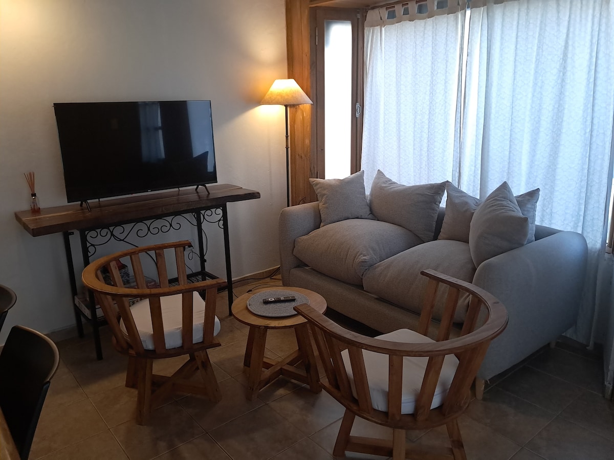 Hospedate en una hermosa cabaña rodeada de arboles y plantas en el centro de la ciudad a 15km del centro de ski. Nuestras cabañas son amplias y cómodas para 5 personas. Equipadas para que disfrutes de tu estancia en cualquier época del año. Cerca de tiendas y restaurantes. PB: Cocina, living con estufa a leña y smart TV, habitación principal y toilet. PA: Habitación con cama twin y cucheta, baño completo. Cochera individual techada cabana.laspeonias