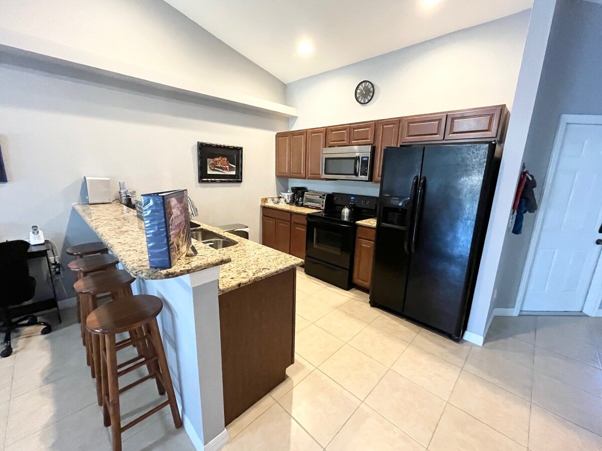 3 Bedroom, 2 bath, 1 car garage apartment in a duplex with a king sized bed in the master and 2 twins each in the other bedrooms. Futon couch can be converted to a small bed. Contact-free, keyless codes used to enter apartment. Within walking distance to a restaurant, pharmacy, convenience store and public park gym. Ping pong table, mini pool table, darts, board games, and a putting green available. Located near the intersection of Santa Barbara Blvd and Nicholas Parkway.