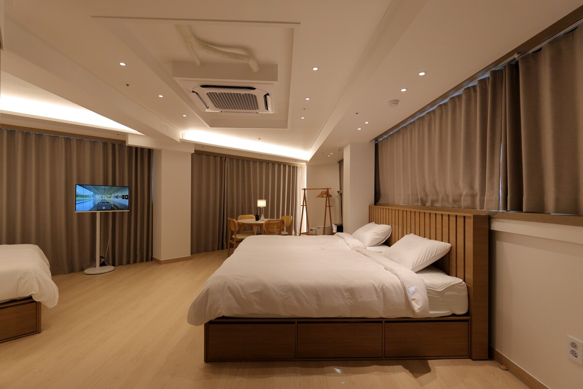 🌿 Harujae – Urban Emotional Accommodation Deluxe -1 queen bed -This room is suitable for both foreign tourists, friends, and lovers.👫 Automatically assigned by the system among 4 rooms 🌿open event🌿 10% additional discount for 3 nights or more 13% additional discount for 5 nights or more The price is automatically adjusted Perfect location in the heart of Seoul, just 4 minutes from Chungmuro Station and Euljiro 3-ga Station🚶♂️, walking distance to Myeongdong and Hipjiro! 🌲 Warm wood interiors and fresh plentiful The rooms with 🛏️ handmade beds and high-quality 60 thread count duck feathers provide a special rest for families, couples, and foreign travelers alike. ✨ 🌿Transportation -Airport bus 6001, 6015 5 minutes on foot from Chungmuro Station, Hanok Village, and Korean House - Subway 4-minute walk from Chungmuro Station on Lines 3 and 4 4-minute walk from Euljiro 3-ga Station on Lines 2 and 3 10 minutes on foot from Euljiro 5-ga Station on Lines 2 and 5 There is no elevator 🚗 Parking is not provided.