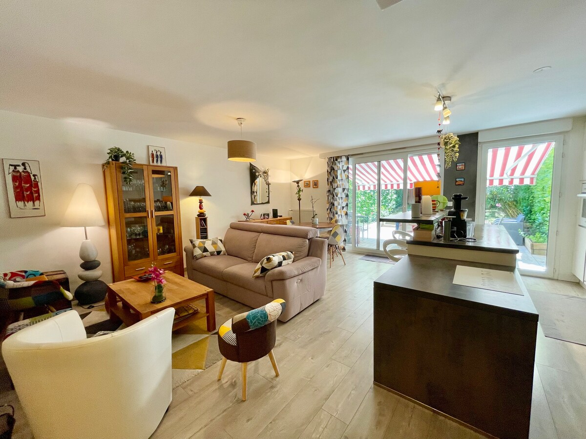 2⭐ furnished tourist duplex with separate entrance, garden and shared pool🏊♂️ in season. Ground floor: equipped kitchenette, ideal for breakfasts and simple meals, and bathroom. Upstairs: 2 air-conditioned bedrooms and living room TV + sofa bed, furnished under the attic, rooms in a row. Quiet neighborhood, close to the Vaulx-en-Velin La Soie metro/tram and shops. Free parking. We live on site, the guest space is completely separate for comfort and privacy.