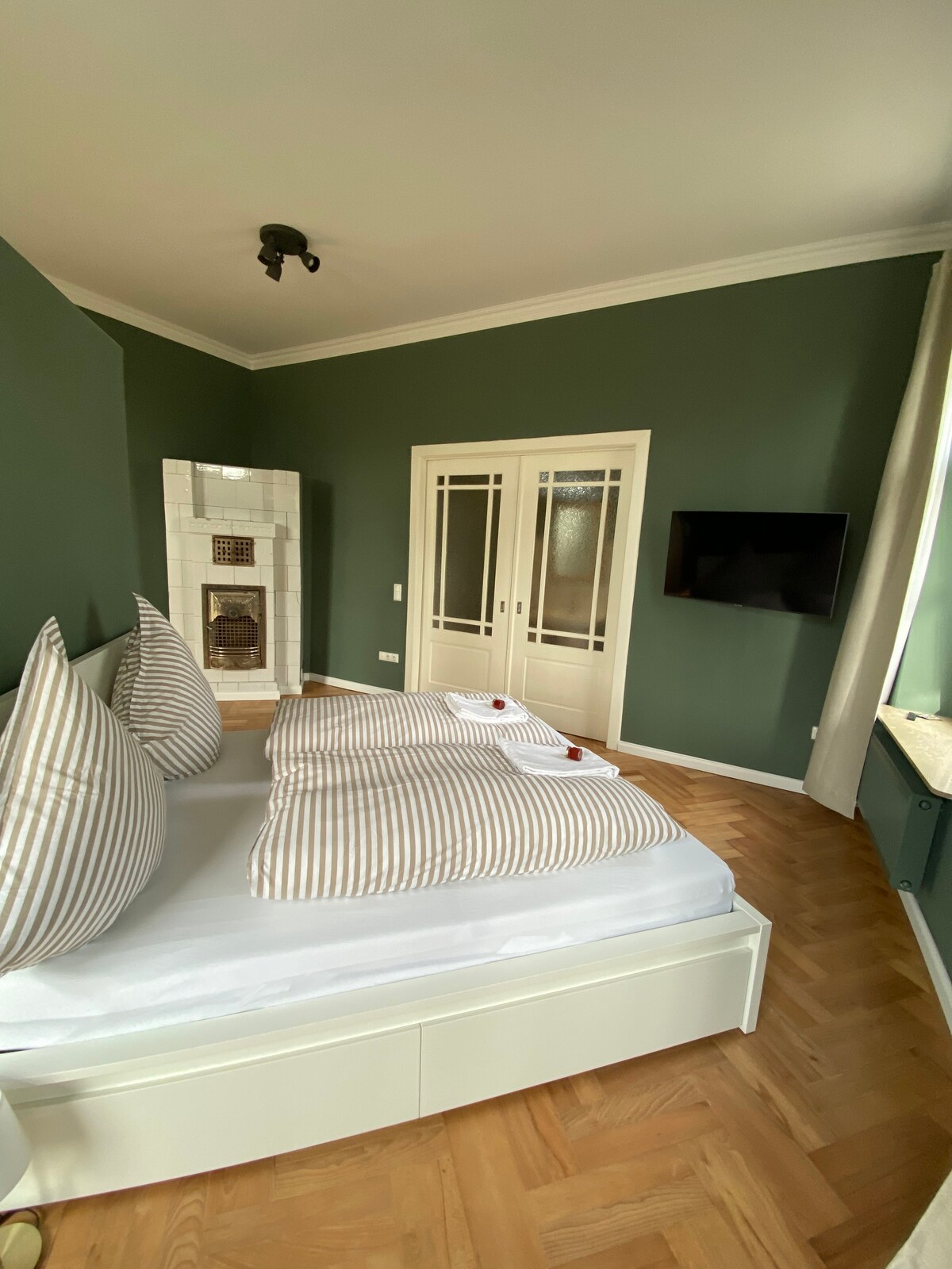 Our apartment is located in the former living area of an old and extensively renovated Gulfhof, at the foot of the dike, in the midst of a nature reserve. High ceilings, thick beams, large wooden windows with a great view into the East Frisian landscape and a modern decor with great attention to detail make this apartment a place to come down and relax.
