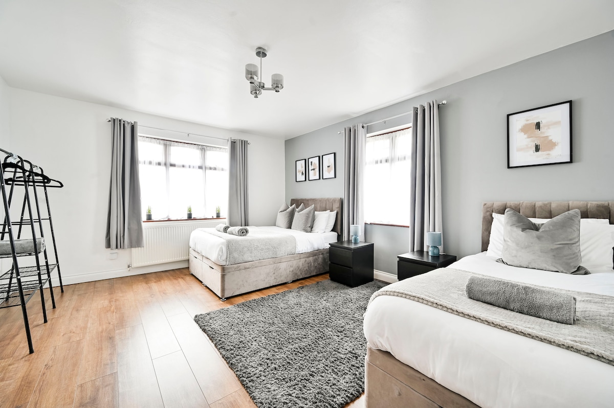 Modern 4-bedroom home with 6 beds and 3 bathrooms, including an en-suite. Perfect for families, business travelers, or groups, this stylish property offers comfort and convenience. Just a short walk to the London ExCel Exhibition Centre and Royal Victoria Station, with quick train access to Canary Wharf and the O2 Arena. Spacious and thoughtfully designed, it’s the ideal base for exploring London. FREE PARKING available