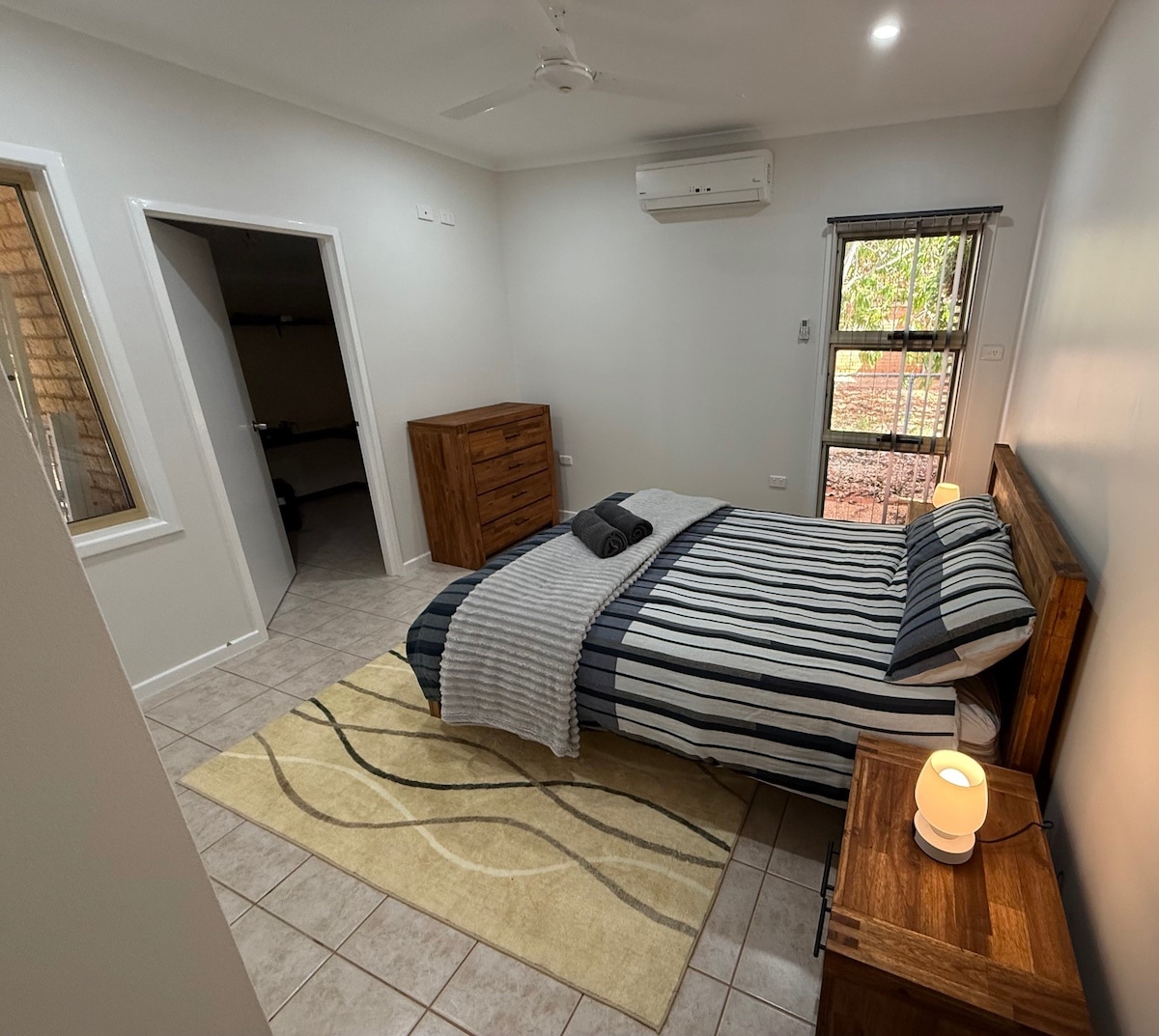 Private 2 bedroom, 2 bathroom retreat. Built with a modern finish, located conveniently in walking distance to Exmouth town centres pubs, restaurants, cafes and other attractions. Perfect getaway with a nicely sized private yard and alfresco area with all day shade. A great base for all your Exmouth Adventures. Each room has its own split system air conditioner and ceiling fan.