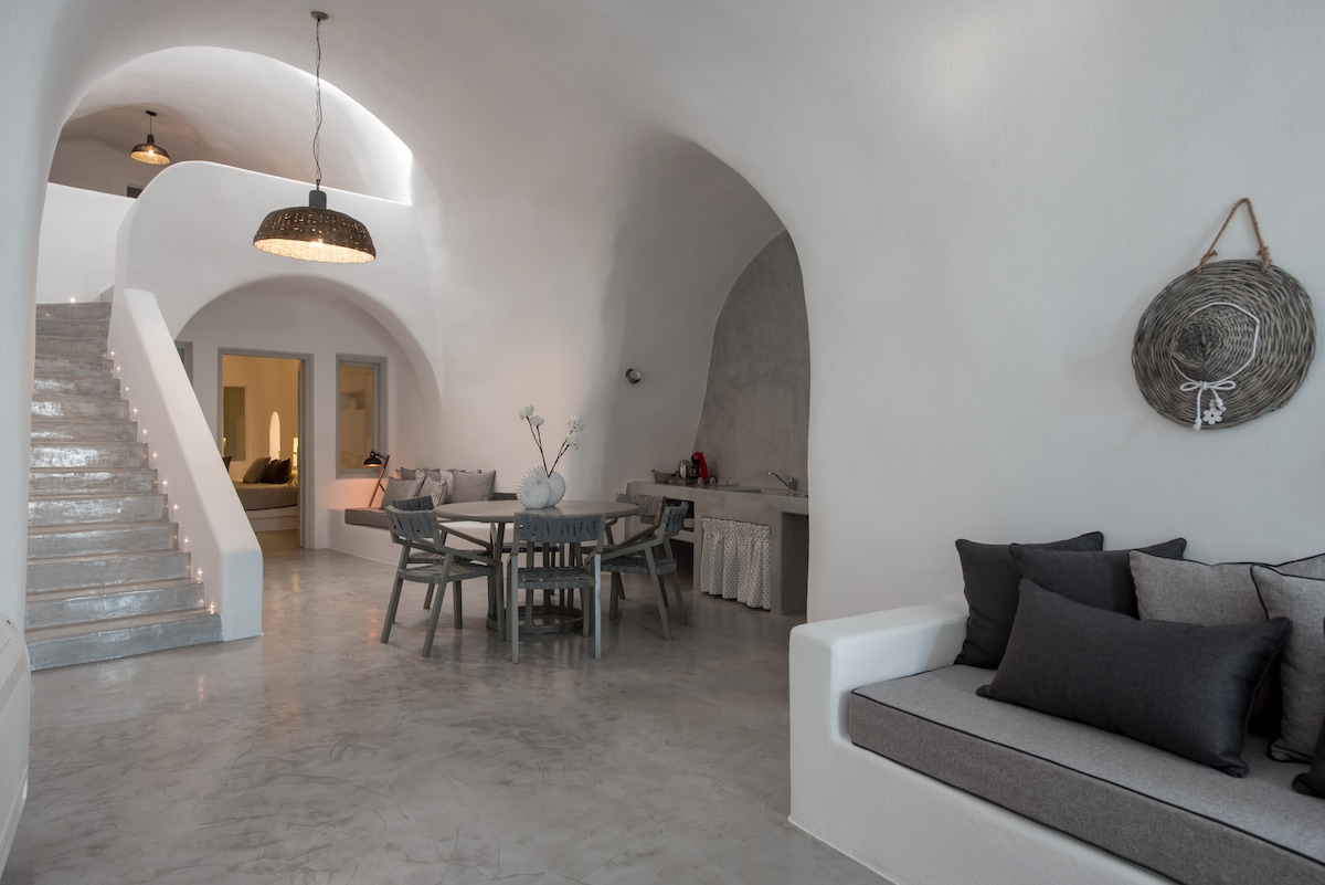 Mirabo Villa’s homonymous suite built in maisonette style has two different leveled bedrooms with double beds making it ideal for families, group of friends and honeymooners who want to enjoy their holidays in a very comfortable and relaxing way. The two separate and spacious bathrooms are beautifully styled and the living room offers hours of relaxation . On the second floor, you can enjoy the caldera & volcano views and the sunset from the private balcony.