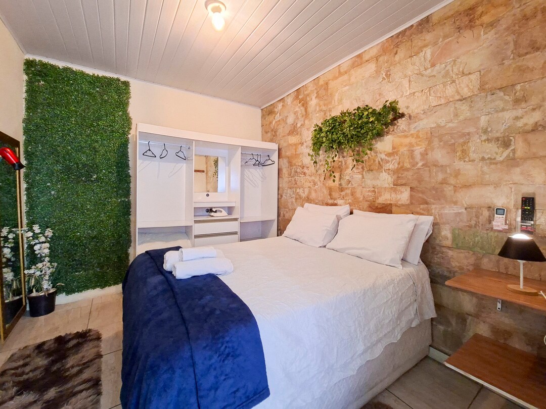 Studio Apartment # 1- double bed. Great location, close to PUC (University) and Expominas. Local commerce with bars, restaurants, drugstore and bakery, stationery, printing, car wash, beauty salon. Easy to access location, with a bus stop in front and the subway nearby. If you arrive at a time when I cannot be there, the keys will be available at the Ipiranga gas station. There is no air conditioning, no stove, no garage, the TV is not smart and there is no iron.