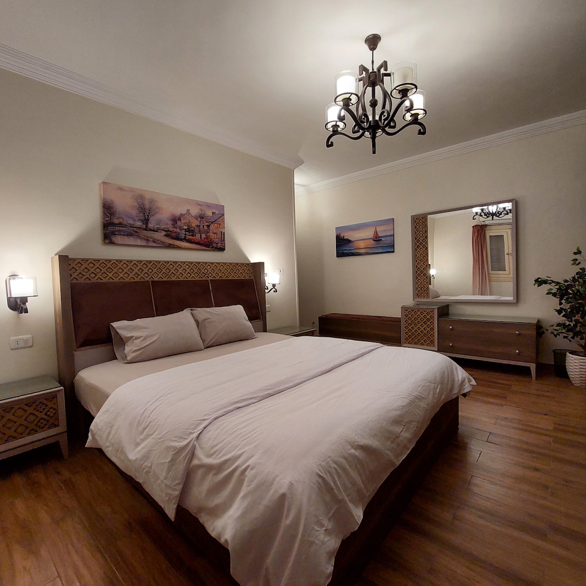 Welcome to our cozy Boho-style apartment in a peaceful, upscale neighborhood! Enjoy a bright space with lush plants, parquet floors, and a fully equipped kitchen. Relax with a 65-inch Smart TV and take in the beautiful garden view. Just a 3-minute walk to local shops and 20 minutes to downtown and the Egyptian Museum, it's the perfect retreat where comfort meets convenience!