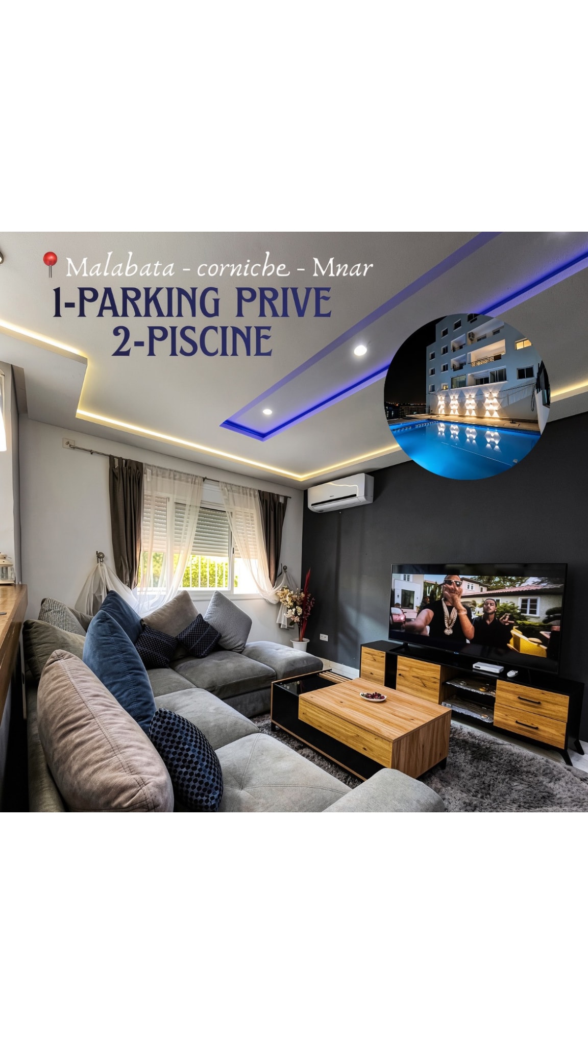 Laissez-vous séduire par cet appartement luxueux, sécurisé et spacieux à Tanger ! Situé dans une résidence de prestige avec 3 piscines, il se distingue par son style moderne et sa terrasse offrant une vue imprenable sur la Méditerranée. Profitez gratuitement des espaces verts, piscines, terrains de tennis et de football. 📍 Service de transfert aéroport/gare disponible sur demande (Service payant non inclus dans le tarif).