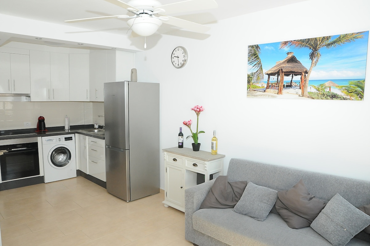 Fantastic new, private and very quiet apartment with 2 swimming pools, it is 4 minutes from the wonderful white beach of La Pinta, next to Puerto Colon, surrounded by shops, restaurants, bars, 600 meters from the Siam Park water park The apartment has a room with 2 single beds, a living room with a sofa bed for 2 people, a new and fully equipped kitchen and a bathroom with a shower, a terrace with beautiful views of the pool, ideal for families.