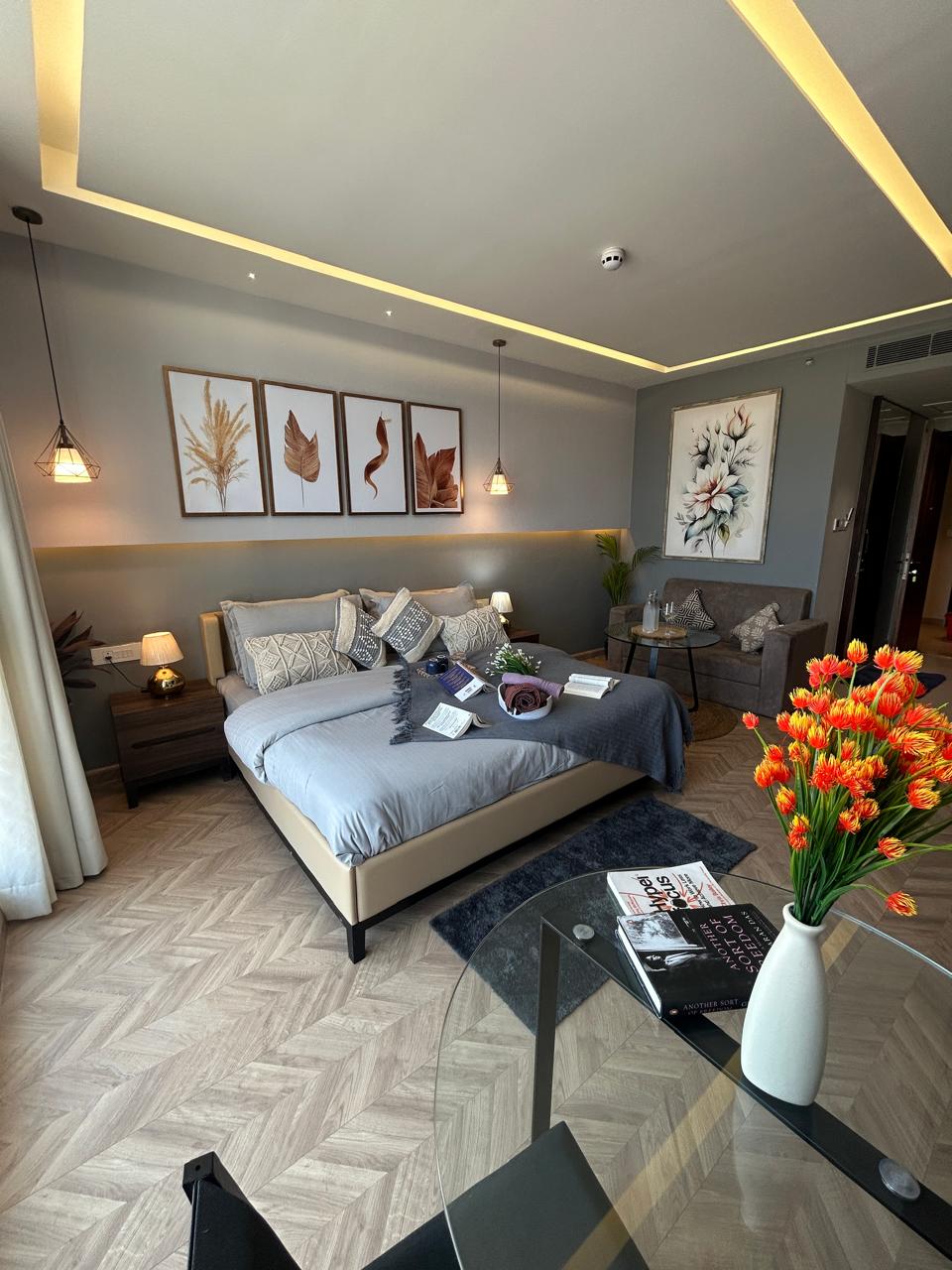 Welcome to this another beautiful and cozy property by Tulip Homes. It is situated on 16th floor & completely fresh apartment with garden patio which makes it unique in class. The place is perfect for relaxing and enjoying scenic view of modern architecture. Apartment is loaded with smart tv (all applications works), big mirror wall, a cozy double bed, big wardrobe with locker, 5 seater sofa, stylish nesting coffee tables, fridge, microwave, induction, electric kettle, toaster, iron & much more