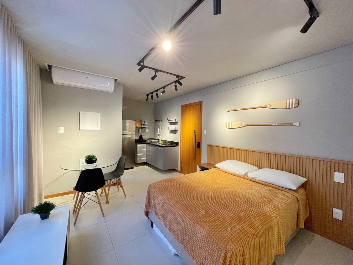 Compact and functional studio in the Barra Premium building, ideal for up to 3 people. It has a standard double bed and an auxiliary single bed. Perfect for leisure or work, it offers complete infrastructure: rooftop with swimming pool, gym, coworking, private meeting room, pay-per-use laundry and parking space. Comfort, practicality and a privileged location for your best experience in Salvador/BA!