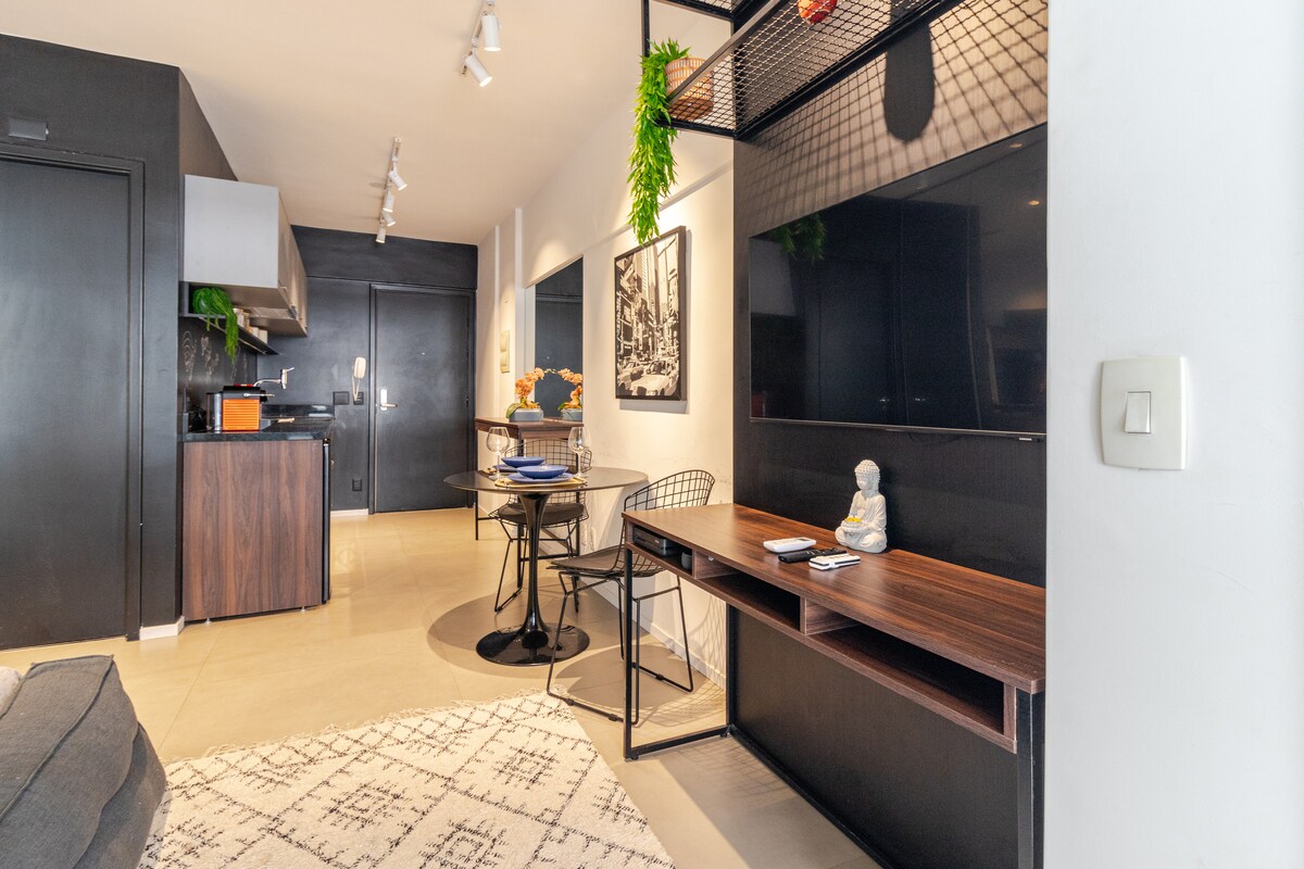 Luxury Studio on Rua Oscar Freire Modern, sophisticated and complete, on the most famous street in São Paulo for luxury stores. Studio on the 24th floor, facing, with magnificent view of Av. Paulista. Well equipped, with 55-inch TV, Vivo Fibra 200 Wifi Internet, cable TV, silent air-conditioning, coffee maker, cooktop and minibar, automated black-out curtain, portable clothes steamer, kitchen utensils, hairdryer, soft sheets and towels, soap and shampoo/conditioner kit.