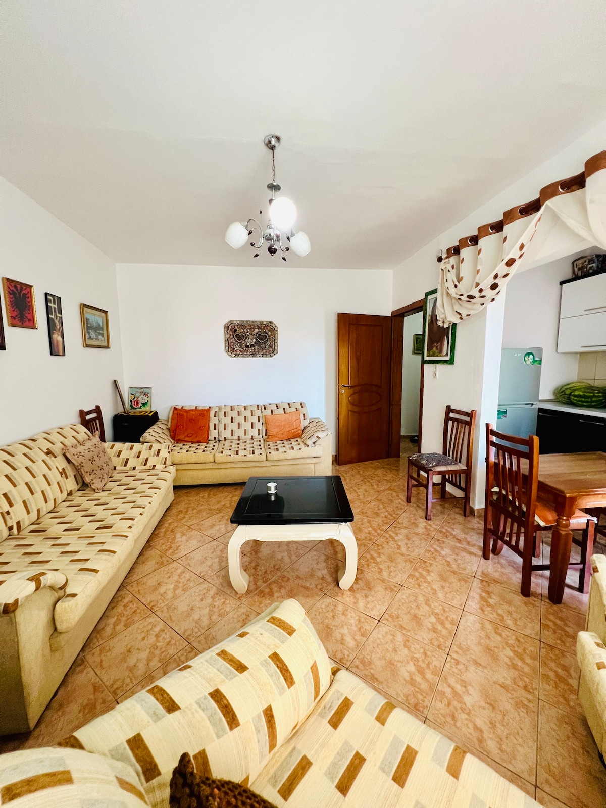 Modern, bright 2-bedroom apartment in the heart of Fier! One queen bed + two twins, sleek living room & fully equipped kitchen. Enjoy the washer/dryer, plus a beautiful balcony with outdoor dining and stunning city views. Just a 2-minute walk to downtown and close to supermarkets, shops, and restaurants—all within 10 minutes. Stylish, central, and perfect for families, friends, or business travelers. Experience Fier in comfort and style!
