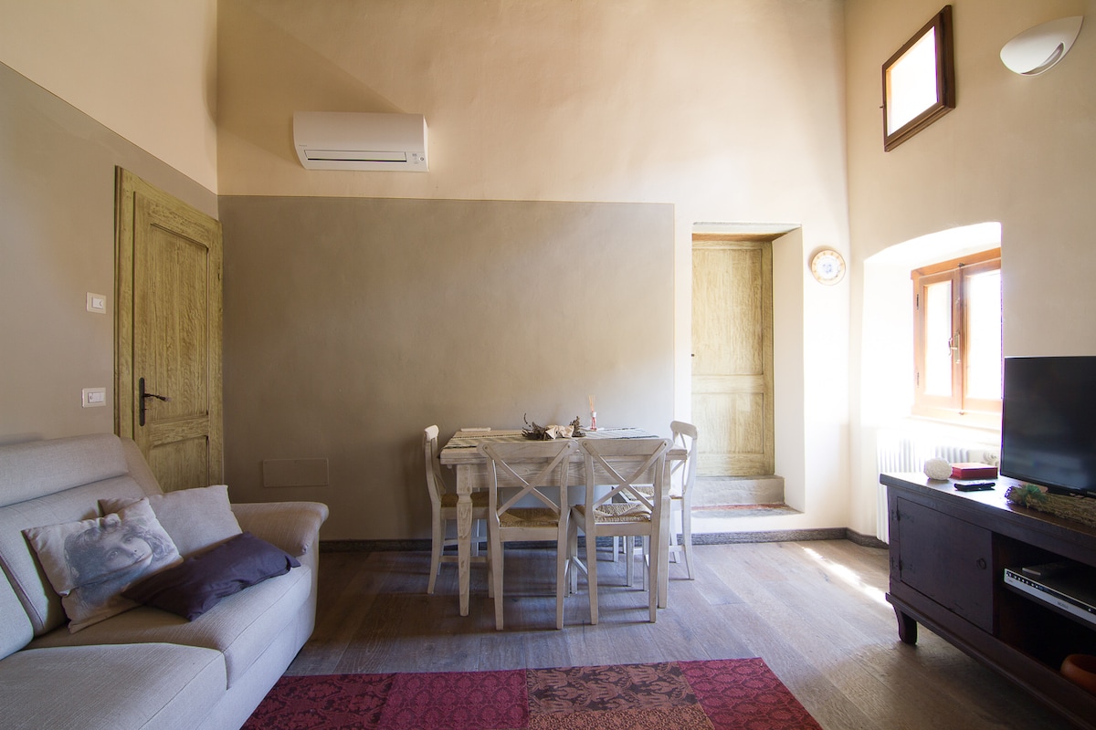 Charming two-room apartment in a beautiful, ancient stone farmhouse surrounded by the green Umbrian countryside, ideal for relaxing in the midst of nature and enjoying pleasant walks in the woods. Just a five-minute drive to the center of Città di Castello. IG: @bilocalenelbosco NB: From July 1, 2024, it is mandatory to pay the tourist tax for the Municipality of Città di Castello. The tax is equivalent to 1.5 euros per night per person for a maximum of three nights, to be paid on site.