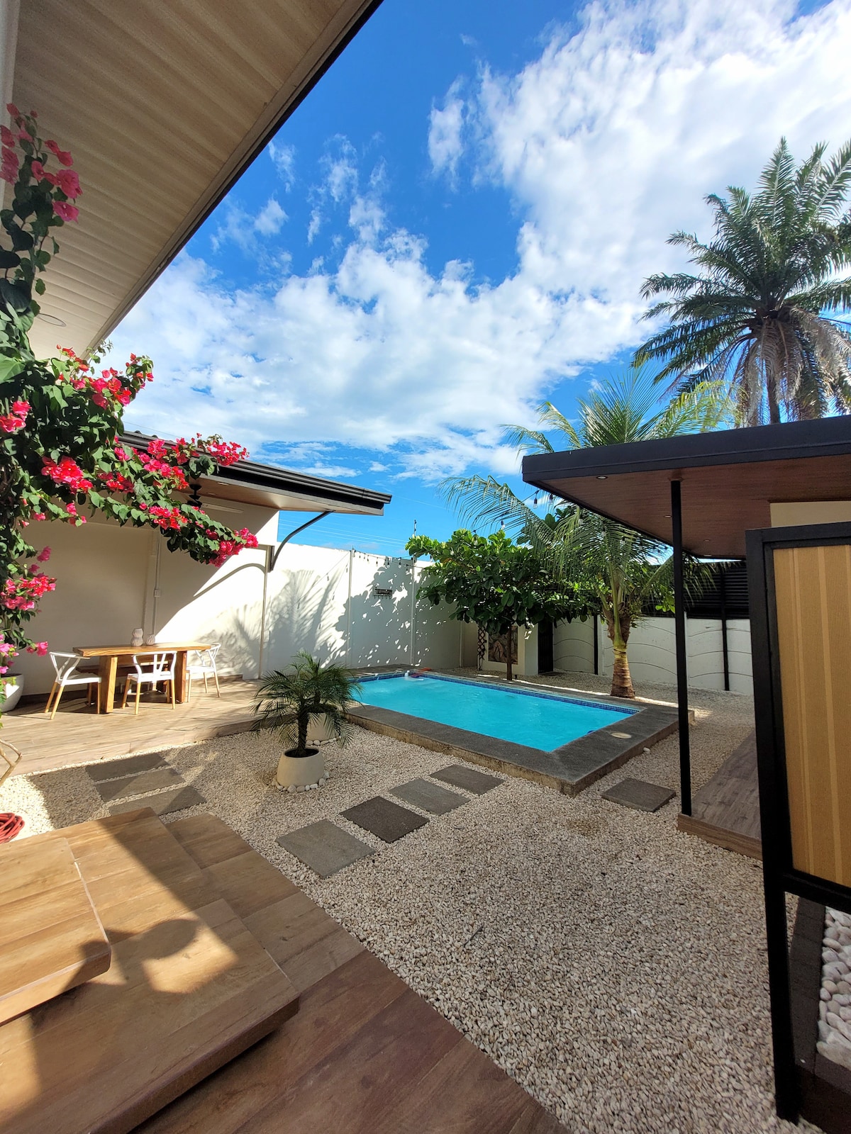Modern suite surrounded by nature, just 2 min from famous surf beach Playa Hermosa (near Jacó). Comfortable space with 2 bedrooms (with A/C), 1 bathroom, and an outdoor covered kitchen/dining area. Relax on the terrace with garden views and spot white-faced monkeys, macaws, and toucans that visit daily. The guest suite is on the ground floor with private entrance but is part of our home where your host family lives. The fenced garden and parking are shared with us.
