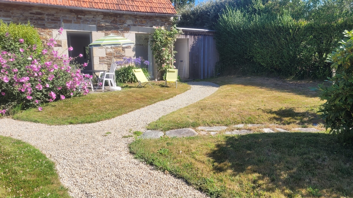 Vacation rental in PLOUEGAT-MOYSAN (Finistère). Ideal location of our house to explore the Bay of Morlaix, the Bay of Lannion, the pink granite coast, inland Brittany with the Valley of the Saints as well as the Monts d'Arrée and this beautiful forest of Huelgoat. You're ten minutes from the beach. The studio overlooks a large, quiet and relaxing flower garden, holidays and relaxation are guaranteed.