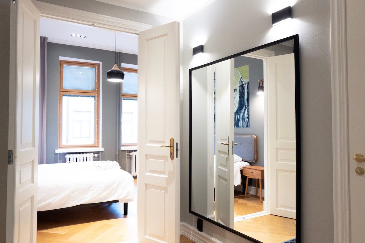 This stylish apartment is located in a historic building right in the city center of Helsinki. The apartment has a new and fully equipped kitchen, spacious modern bathroom, herringbone parquet and an art collection by Finnish modern artists. The apartment has a washing machine and a dryer for guests to use. A grand dining table, two separate washrooms and sofa beds (made upon request) make the apartment also suitable for families and small groups.