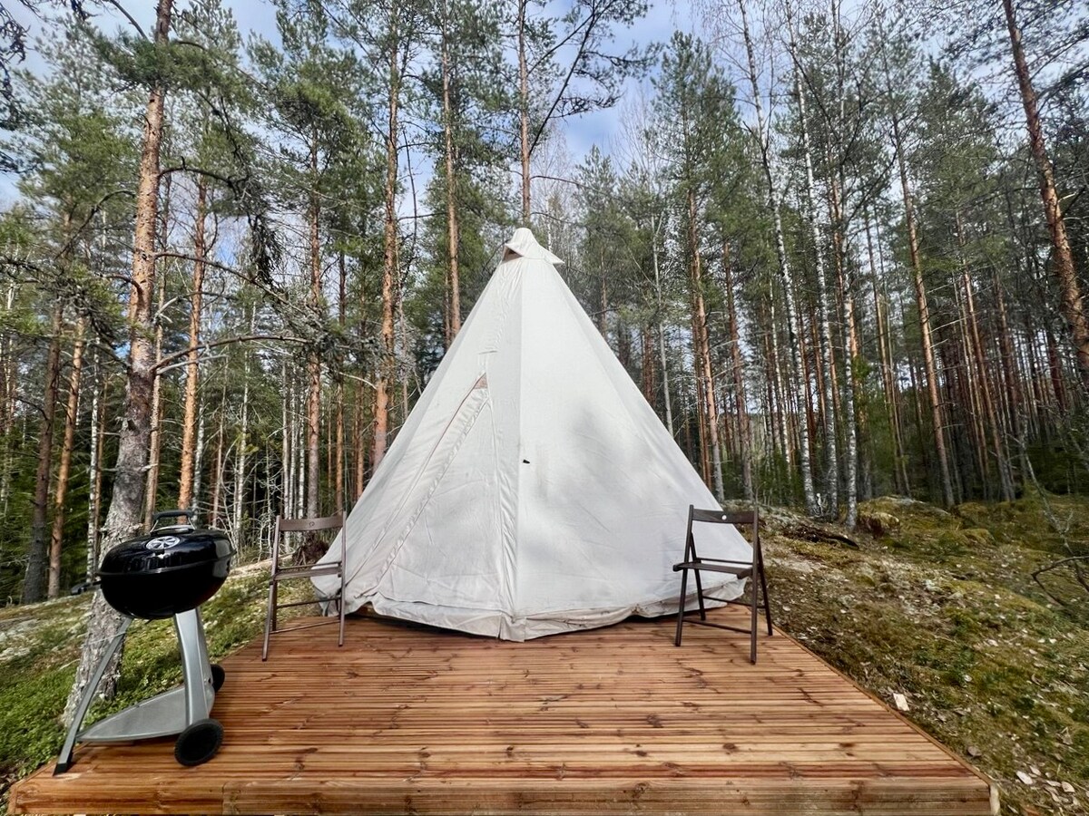 Pure nature! Kalliokumpu EcoLodge glamping tent (for 2 people/max. 4) is located on our 4500 m2 natural rocky private property, surrounded by the magical archipelago forest. Cosy, luxurious 20 m² LotusBelle tent in Scandinavian design. Terrace, wood stove, queen bed, eco toilet & outdoor forest shower. Towels, bed linen & final cleaning including. Homemade breakfast (15 € p.p.). Privat Sauna possible for a fee (40 €/2 hours). Rental bike (20 € p.p./ 1 day).