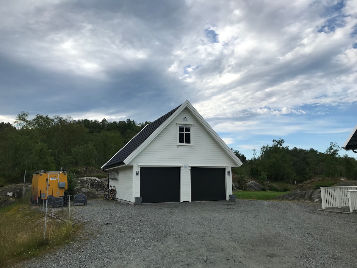 Enjoy fantastic sea views and sunsets in a new modern cabin! Its a quiet area surronded by amazing views and lovely hikes just outside the cabin. It's only one hour drive from Stavanger and the airport. 10 min walk to public beach. All on one level, 150m2. Large private parking. Jacuzzi and big terrasse. Perfect with small kids - relax in the jacuzzi after hike or when kids are sleeping. We have babychairs,babybed etc. Well equipped kitchen, homeoffice with 2screens Pets not allowed